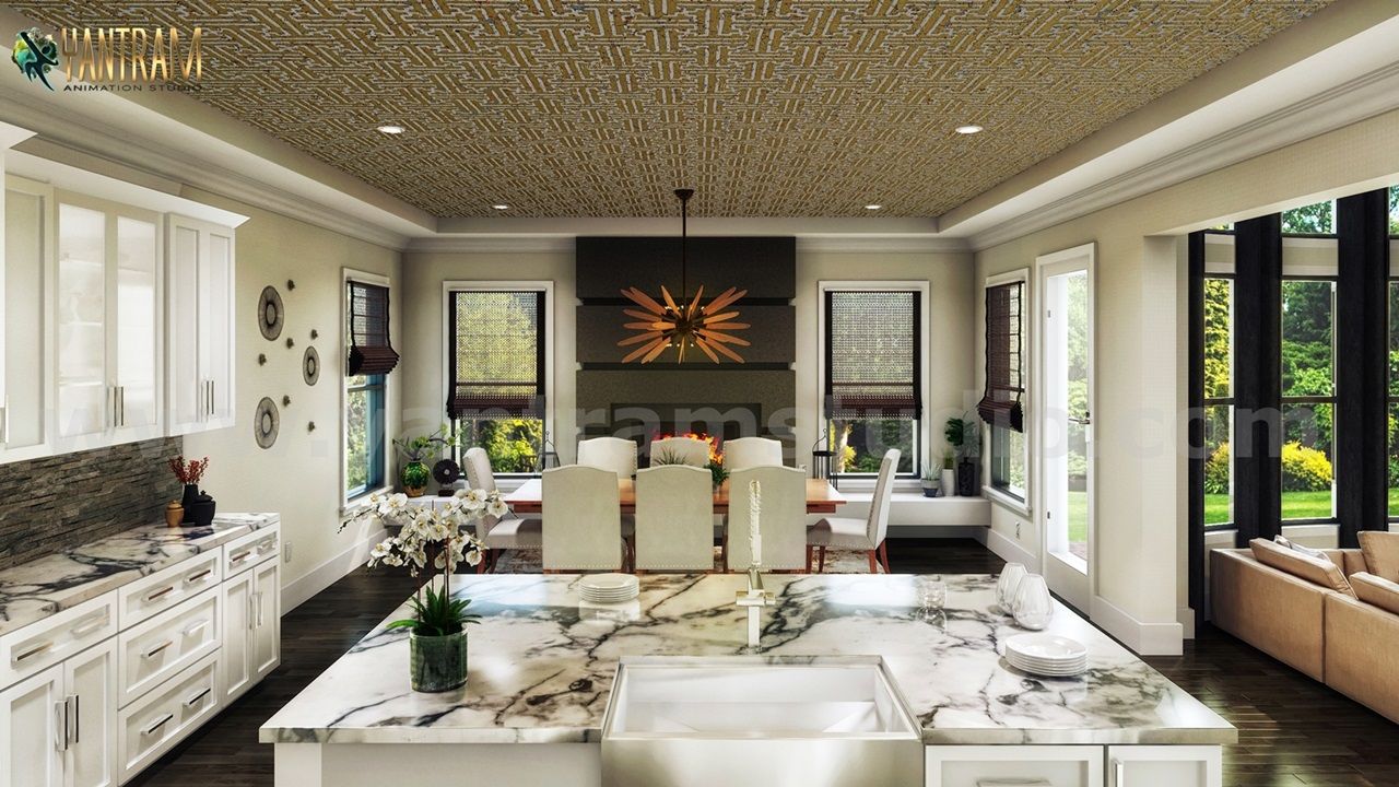 建築レンダリング会社によるキッチン島の朝食用テーブルの現代的な住宅3Dインテリアデザイナー