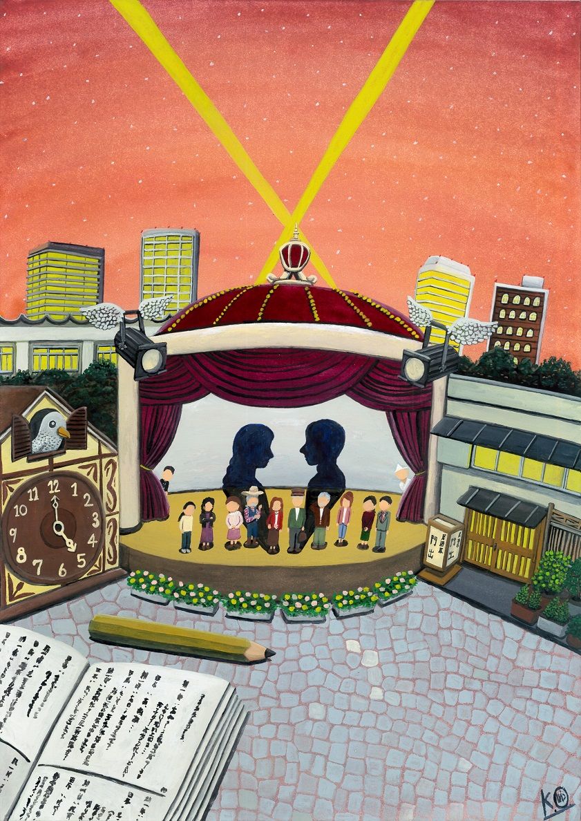 描くに当たっては、団長さんから頂いた脚本を読みながら「物語の舞台」となるである「場所」や手前の脚本・鉛筆・(劇場両端の)照明機械...と言ったモチーフ類を配置して行き、中央の劇場(舞台)に「登場人物」達を並ばせる...と言うような形で描いて行きました。