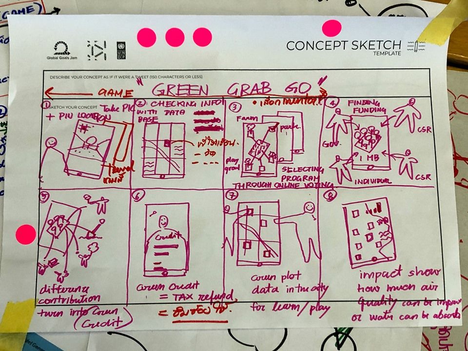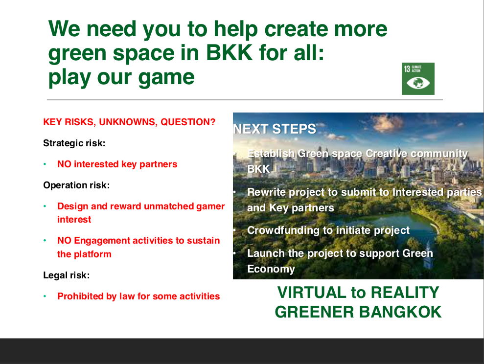 One way the app can be used is that gamers select an underdeveloped non-green space in Bangkok and design their ideal green space in the virtual app. If the land owners agrees to the plan, volunteers can come in to transform the underutilized space into a green space.
