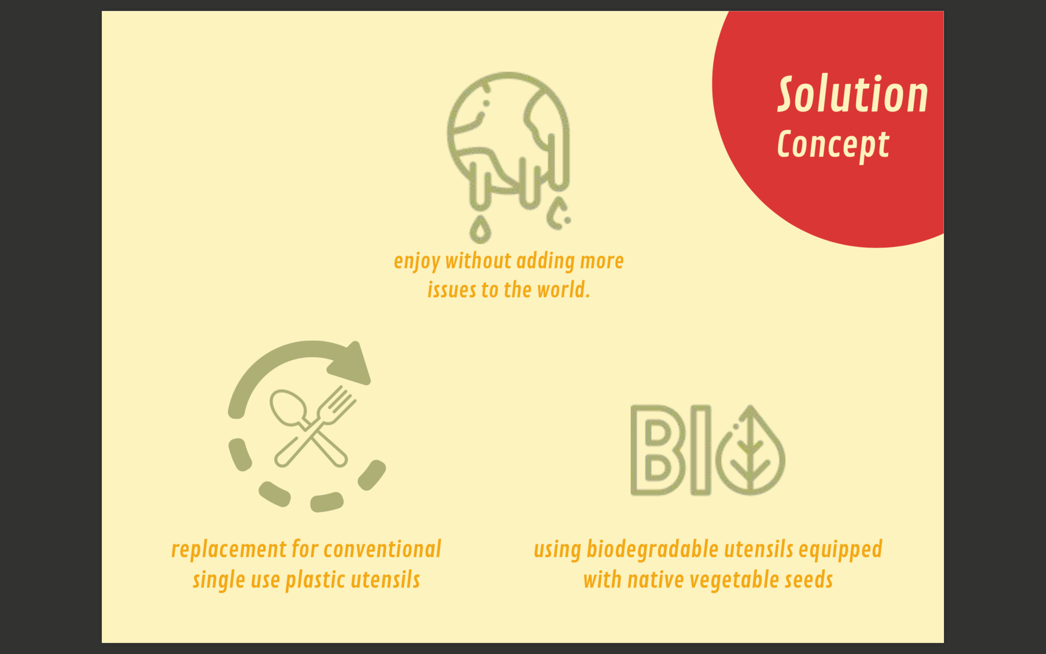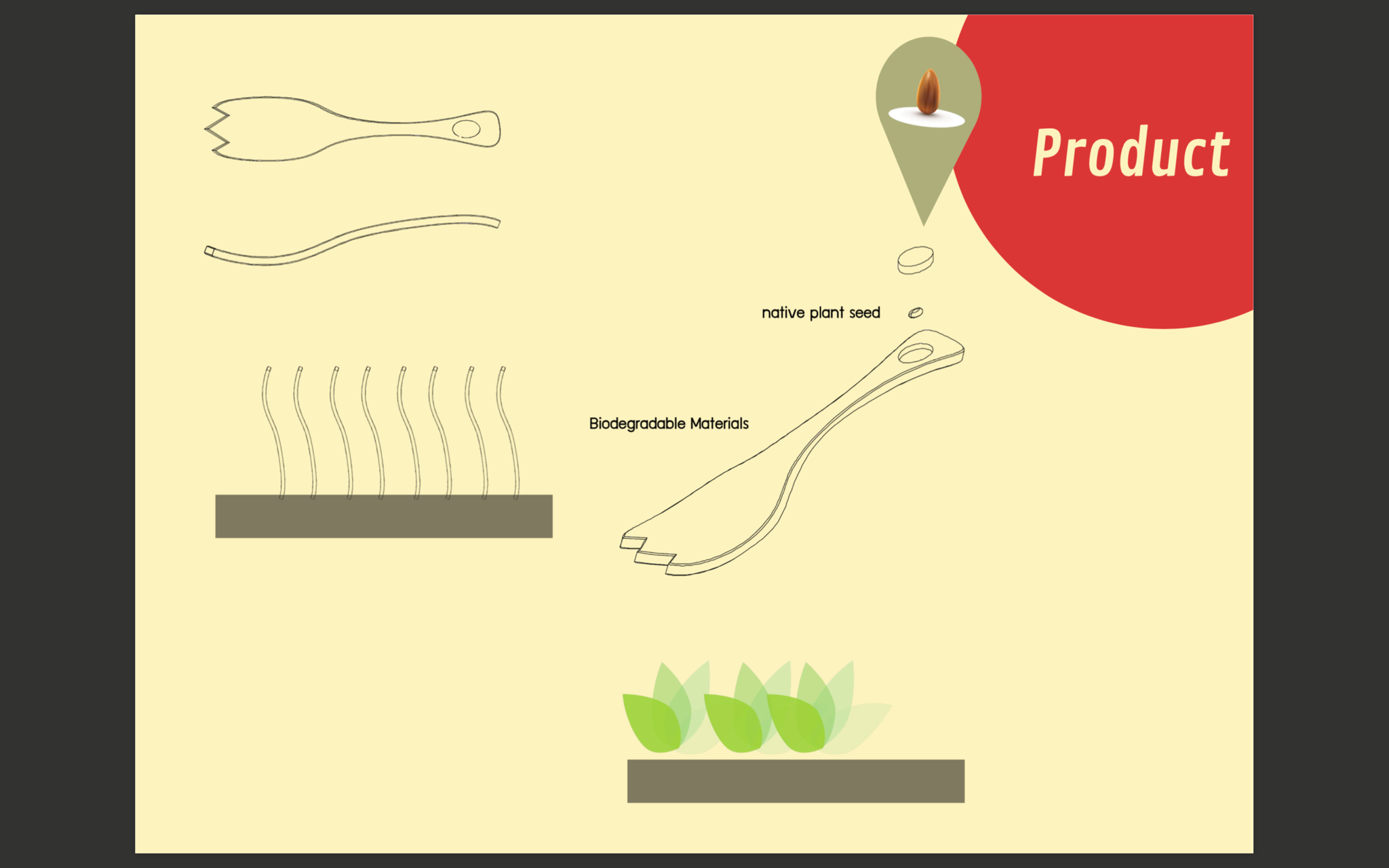 How might we reduce un-recyclable spoon and fork usage without affecting consumer behavior? Introducing Seed every meal! A replacement for coventional single use plastic utensils! These utensils use biodegradable materials and are equipped with native vegetable seeds. Seeds are native plants and are easy to grow.