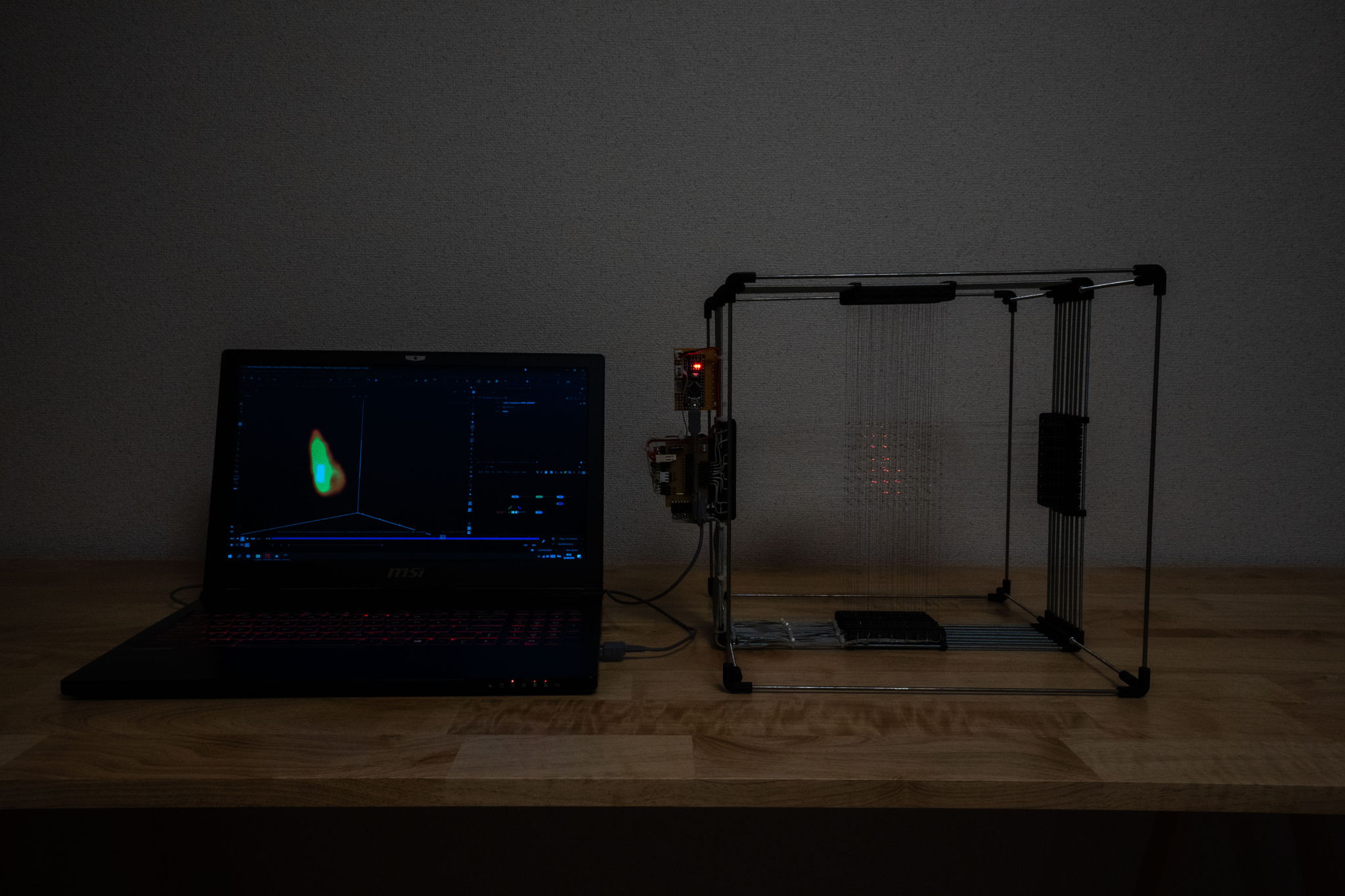 このプロジェクトは3次元の炎を8x8x8のLEDキューブ中に表現させるものである。炎はHoudiniの燃焼及び流体力学シミュレータにより生成され、そのシミュレーション結果を自身で設計・製作した8x8x8のLEDキューブに表示することとした。本プロジェクトは実用的な製品を作るためではなく、炎が作り上げる効果の検証とそのディジタルメディアによる再現を目指している。