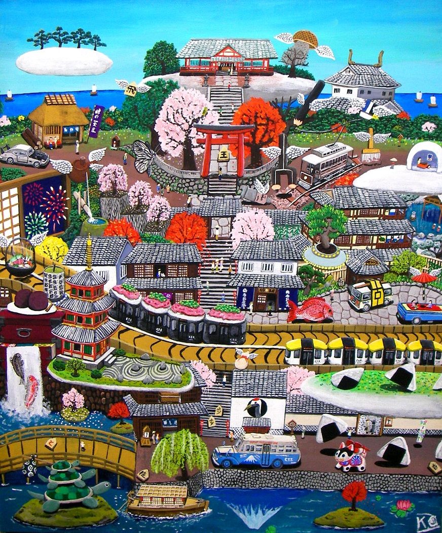 描 くに当たっては、(「JAPANESE FOOL」→「"日本"がテーマ」であると言う事で)「自分が"知っている"日本って何だろう?」と言う事を考えていたのですけど、大方の日本人が「日本 を好きな理由」に挙げるであろう「四季」の世界の中に(「自分の知っている日本」と言う事で)「昔話」や「諺」を絵の中の各所に散りばめたりしました。