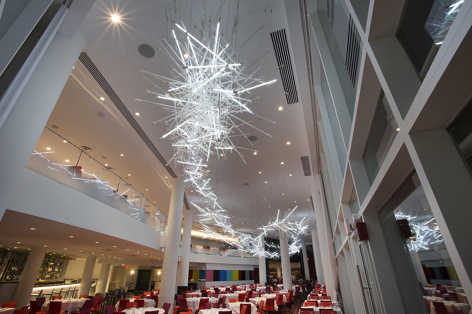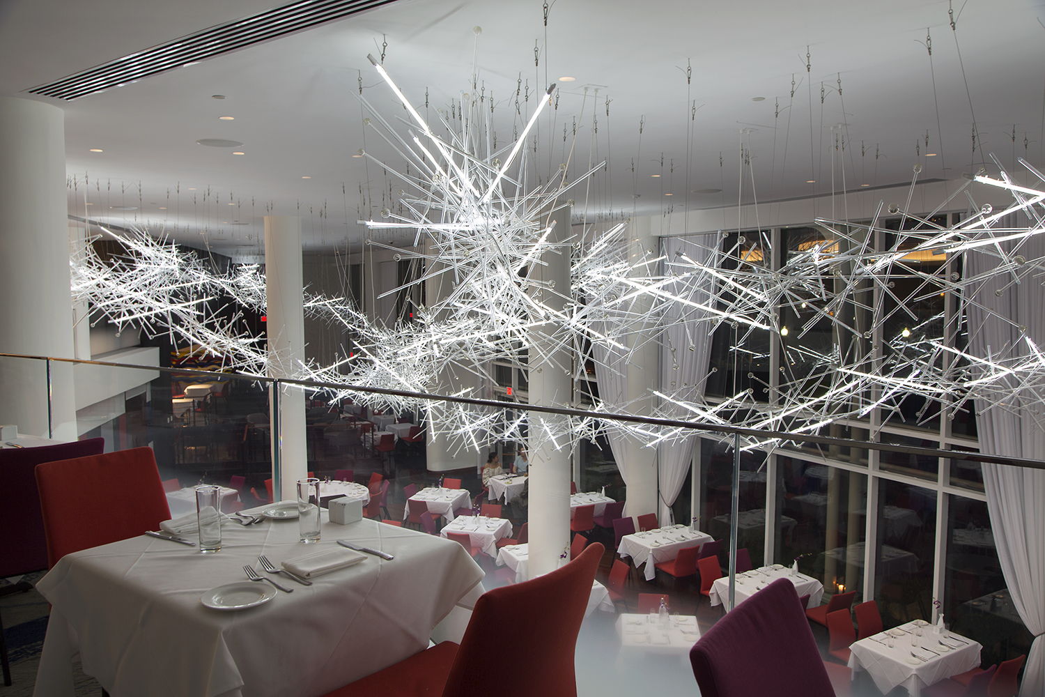 It is created in the one of the famous restaurant called ”Sequoia” around Washington Harbor in Washington D.C. The main dining is about 40 meters in length and 12meters in width, the installation is constructed with 3000 pieces of glass tubes and neon lights. “Sequoia” is a large Californian evergreen tree that can reach a height of more than 90 meters. The imagination of installation comes from this long structure of Sequoia tree and the image of universe that occurs multifactorially like the trees branch off into smaller pieces. Within the whole installation, I express that the universe that has complex phases in which it repeatedly generates and annihilates even beyond our knowledge. In this work, the broken tubes represent the aftermath left in outer space created by the Big Bang, in other words, stars and beings. Inside the glass tubes is a high vacuum, so the phenomenon of these tubes breaking is similar to the beginning of this universe. Therefore, the broken tubes (a kind of “annihilation”) may become a metaphor for the beginning of the universe (“generation”). This work is “generated” (created) by “annihilation” (demolition), and it may represent the ambiguous event (process of making art work).