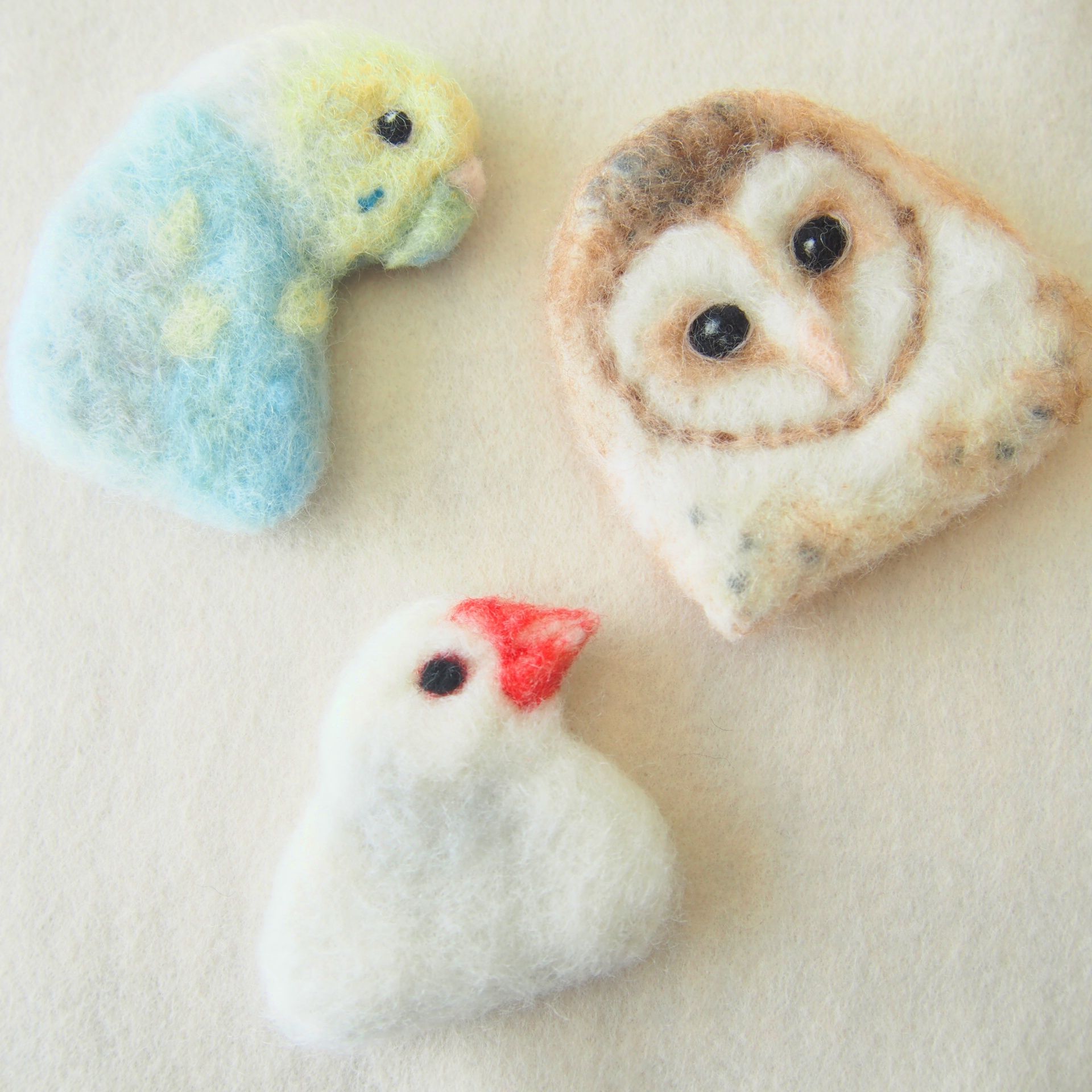 ブローチ風羊毛フェルト絵のセキセイインコ、文鳥、メンフクロウ