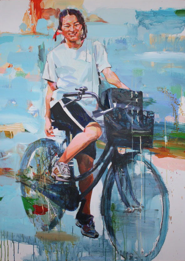 背景、彼女の左横をオレンジの激しい色を塗りたくった。