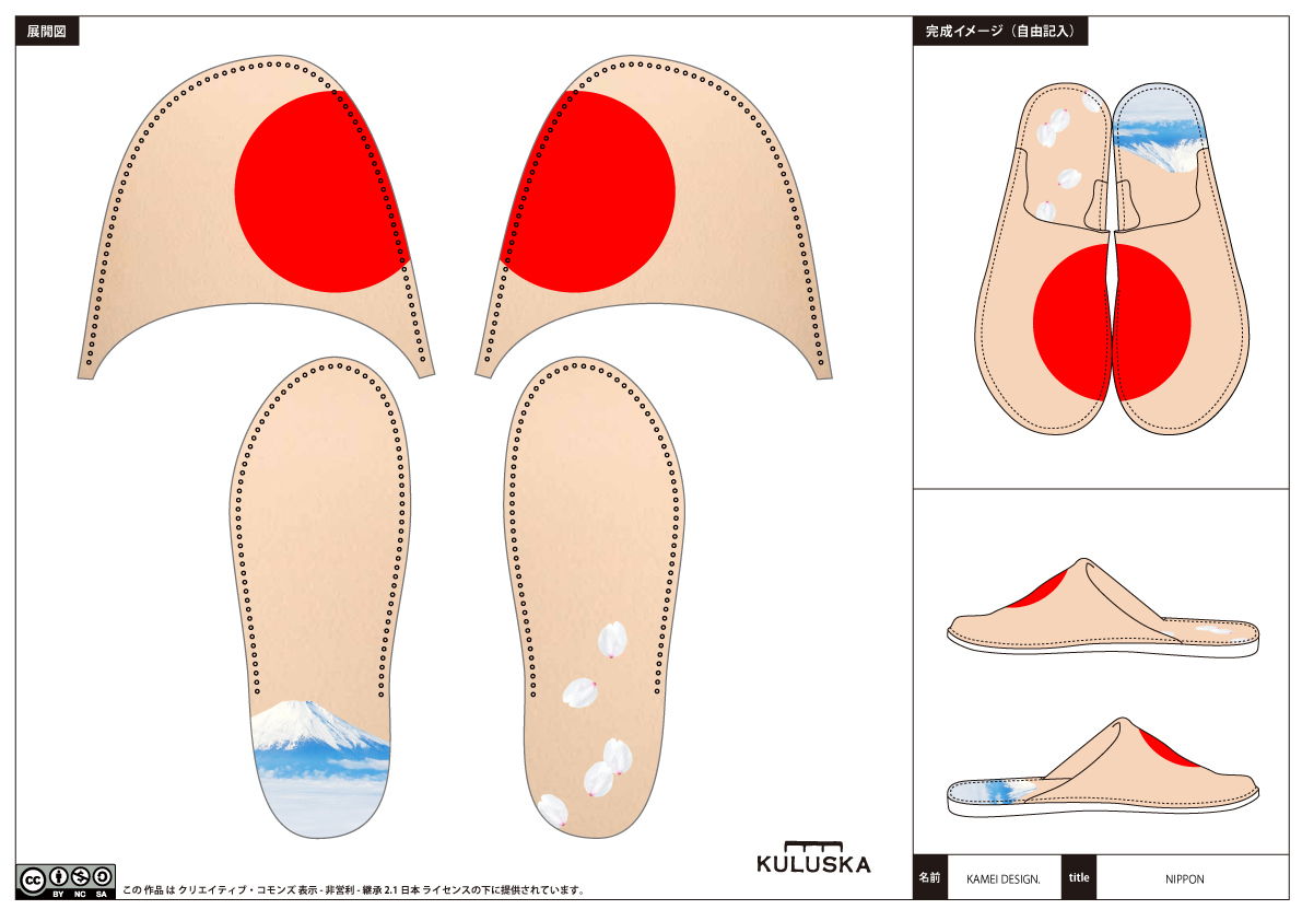 大切なフランス人の親友のために考えた、履くたびに日本の美しさをいつでも感じることのできるシンプルなスリッパです。両足を揃えるとまあるい日の丸が現れます。外国の方に履いてもらって海外を旅して欲しいです。どうぞよろしくお願いいいたします。