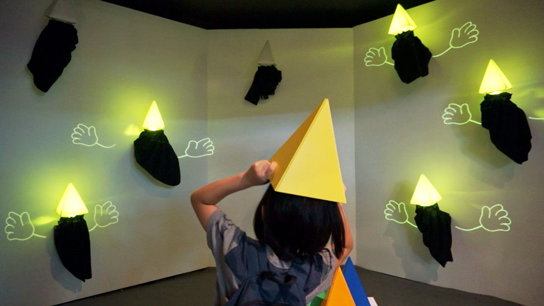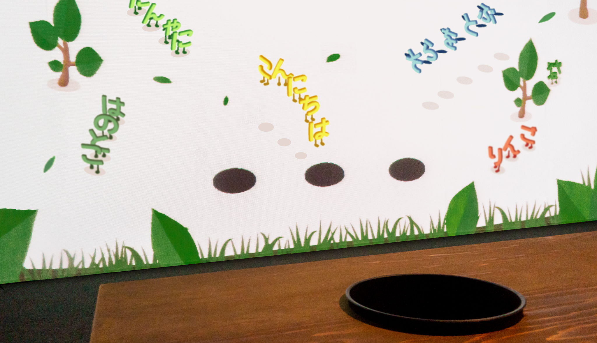 穴にむかって言葉をふきこむと、声から形になった「言葉」がひとりでに歩きはじめ、空間を自由に動き回ります。