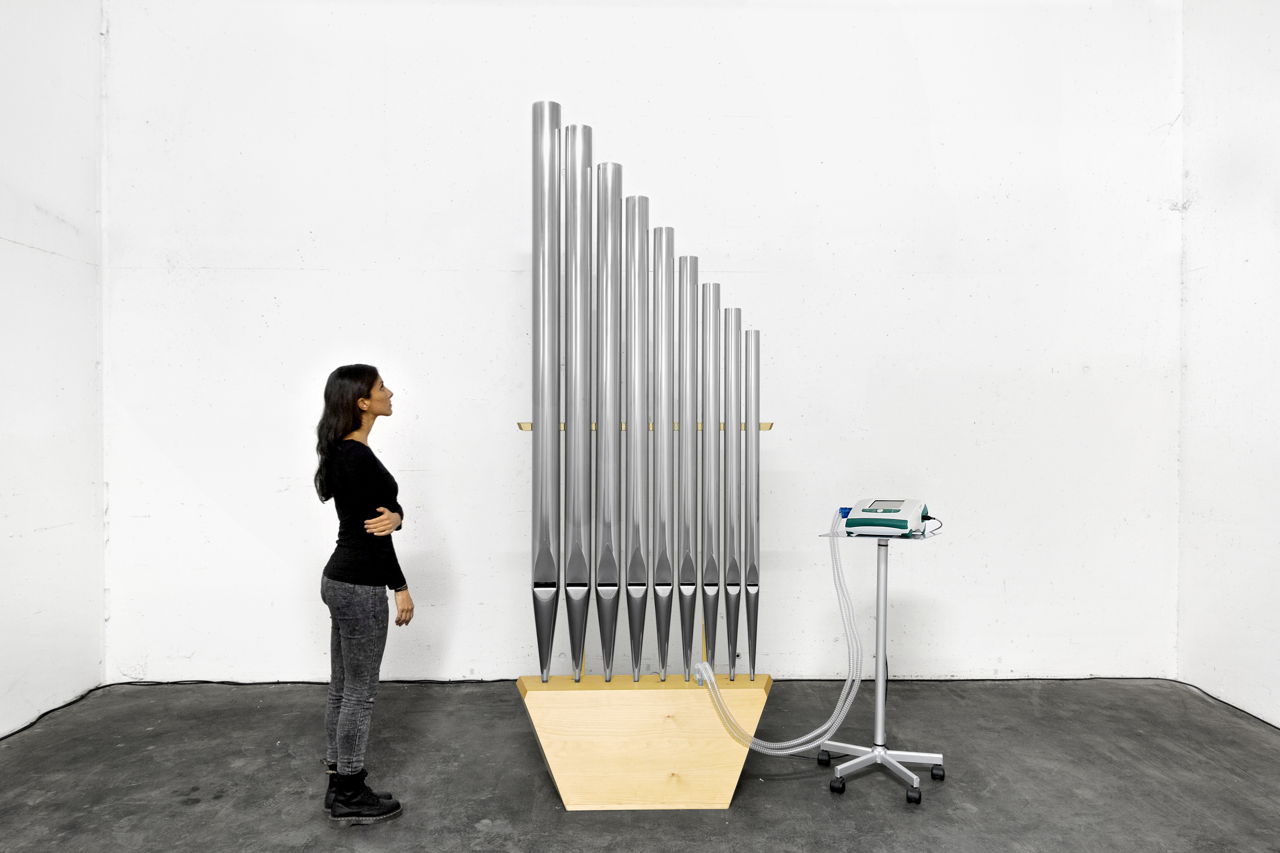The sound sculpture "Ad lib." (2017) combines a medical machine for automatic pulmonary ventilation with a few organ pipes that play a musical chord, a fragment of music (a reference to the "German Requiem" op.45 by Johannes Brahms) frozen to the constant rhythm of the automatic breath.