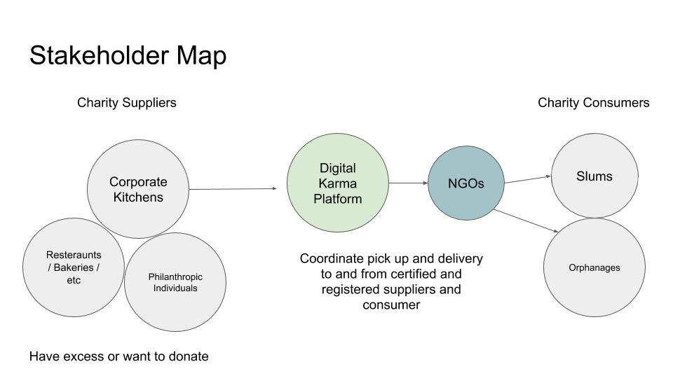 We spent the first sprint understanding the goals of “Digital Karma” through interviewing key stakeholders. We understood the current state of the platform and explored potential improvements with the founding team of the platform. To test our understanding, we elaborated on the problem by creating stakeholder map to understand the various motivations and relationships between all the parties involved.