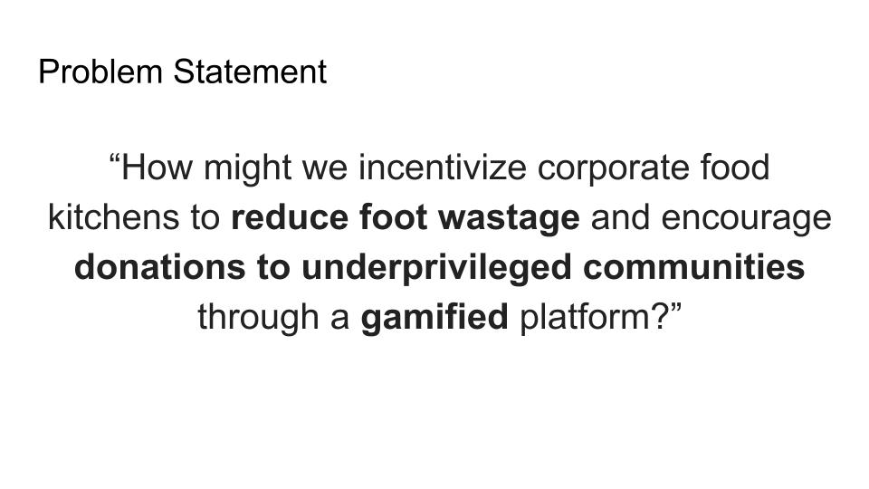 “How might we incentivize corporate food kitchens to reduce foot wastage by incentivizing donations to underprivileged communities through a gamified platform?”