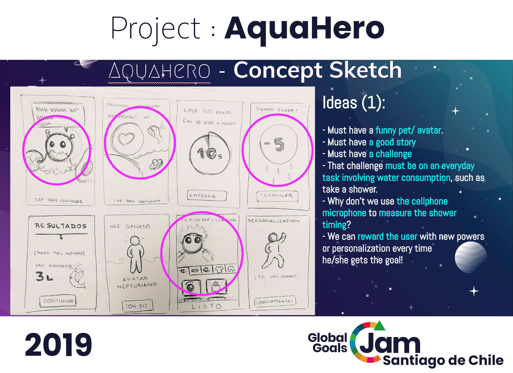 AquaHero is a gamified mobile app to generate water consumption awareness in Chilean teenagers. The app starts with a personalized avatar chosed by the user, and some basic questions about current water consumption habits. Upon that, the app shows a story, challenging the user to improve a current habit, for example, shower timing. The mobile app use the microphone feature to sensing the water sound, starting an inner timing. If the water sound stops before the time is up, the user gets a reward such as points, magic features or personalization. If not, character's life decreases and the challenge would appear again any other day.