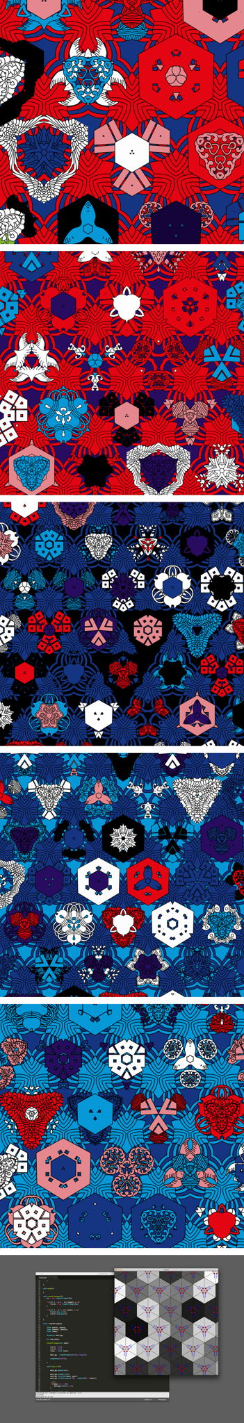 正六角形で平面を敷き詰めたところにSVGファイルを読み込み配置、着色しています。