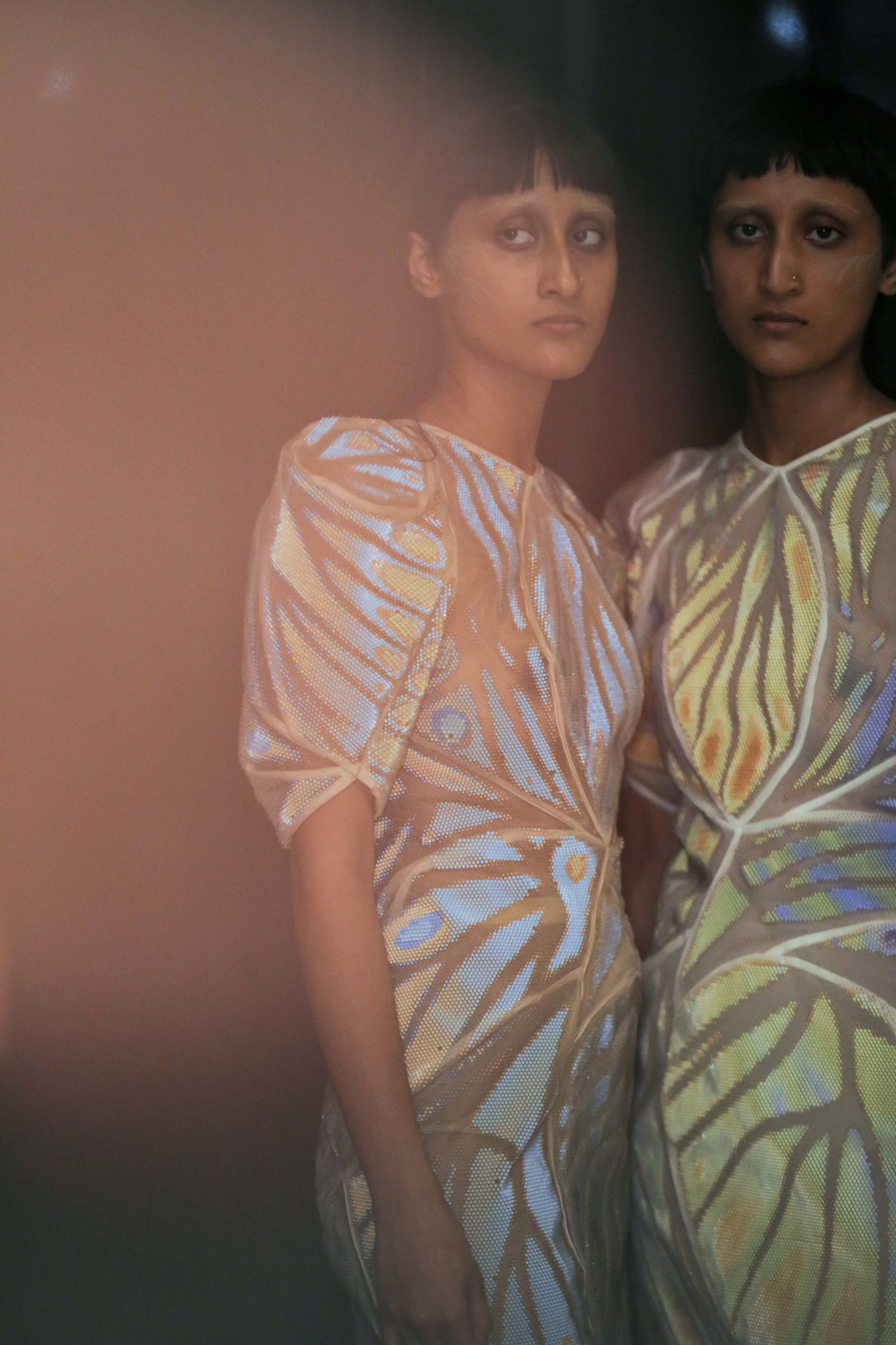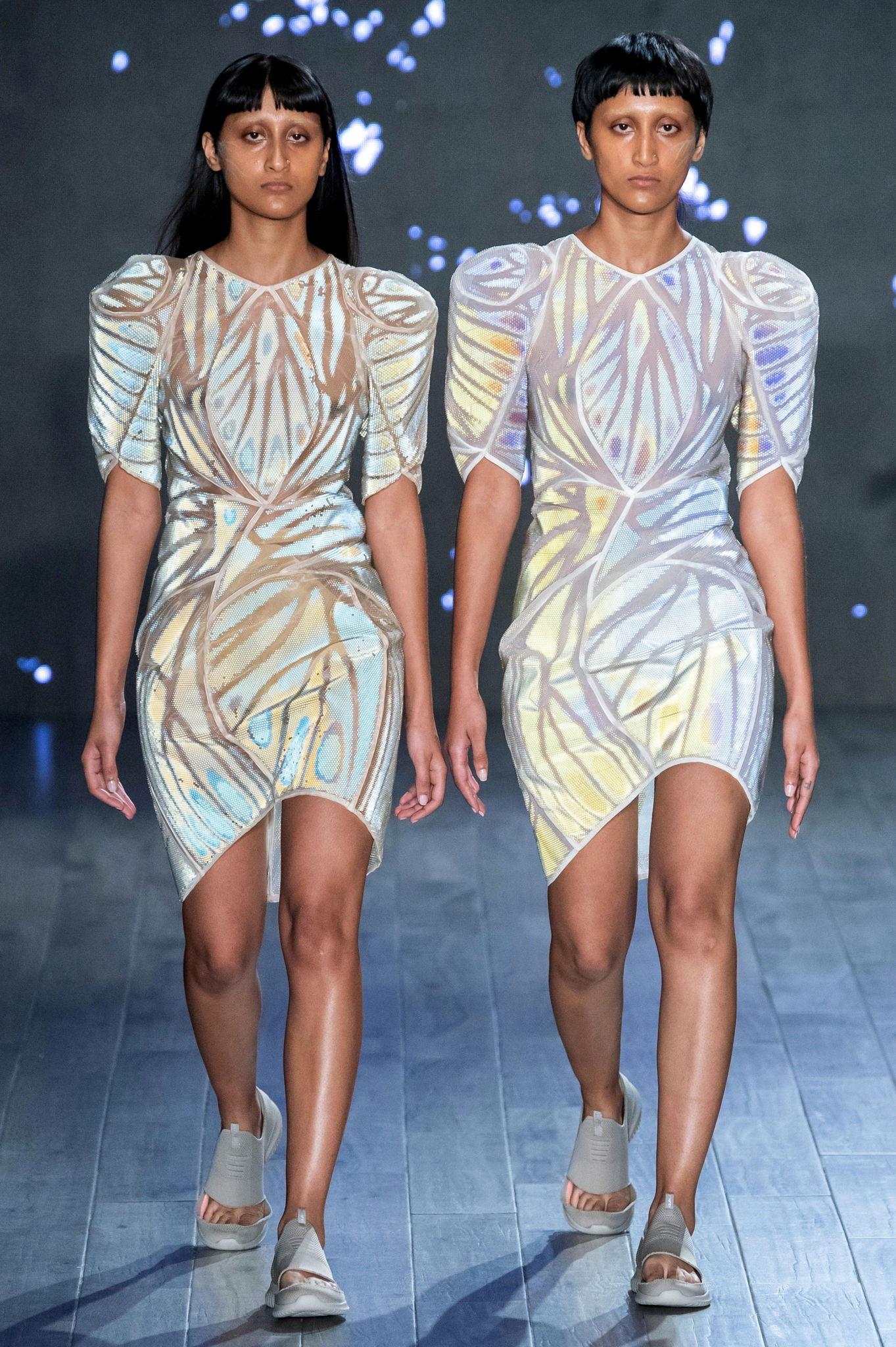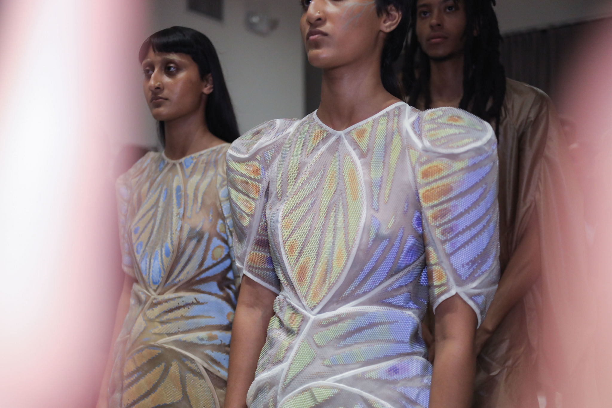 Greta Oto was developed in collaboration with the fashion studio threeAsfour for Stratasys 2019 Chro-Morpho collection, now on display at the Philadelphia Museum of Art’s exhibition Design for Different Futures. The project explores the microscopic play of light and color that occurs in butterfly wings, using new fabrication processes to synthesize naturally occurring optical effects. By 3D printing scale-sized lenses directly onto polyester fabric, we’ve developed a unique approach to producing flexible, lenticular textiles. The dress is an assembly of 27 “prints” composed of thousands of individual, transparent spherical cells. Depending on the angle of view, each cell refracts one of two underlying strips of color to create an iridescent and dynamic gradient of gold and blue. The final construction hybridizes traditional and digital craft processes to demonstrate how, through the study of biological systems, we can develop novel and innovative approaches to what a textile can do.