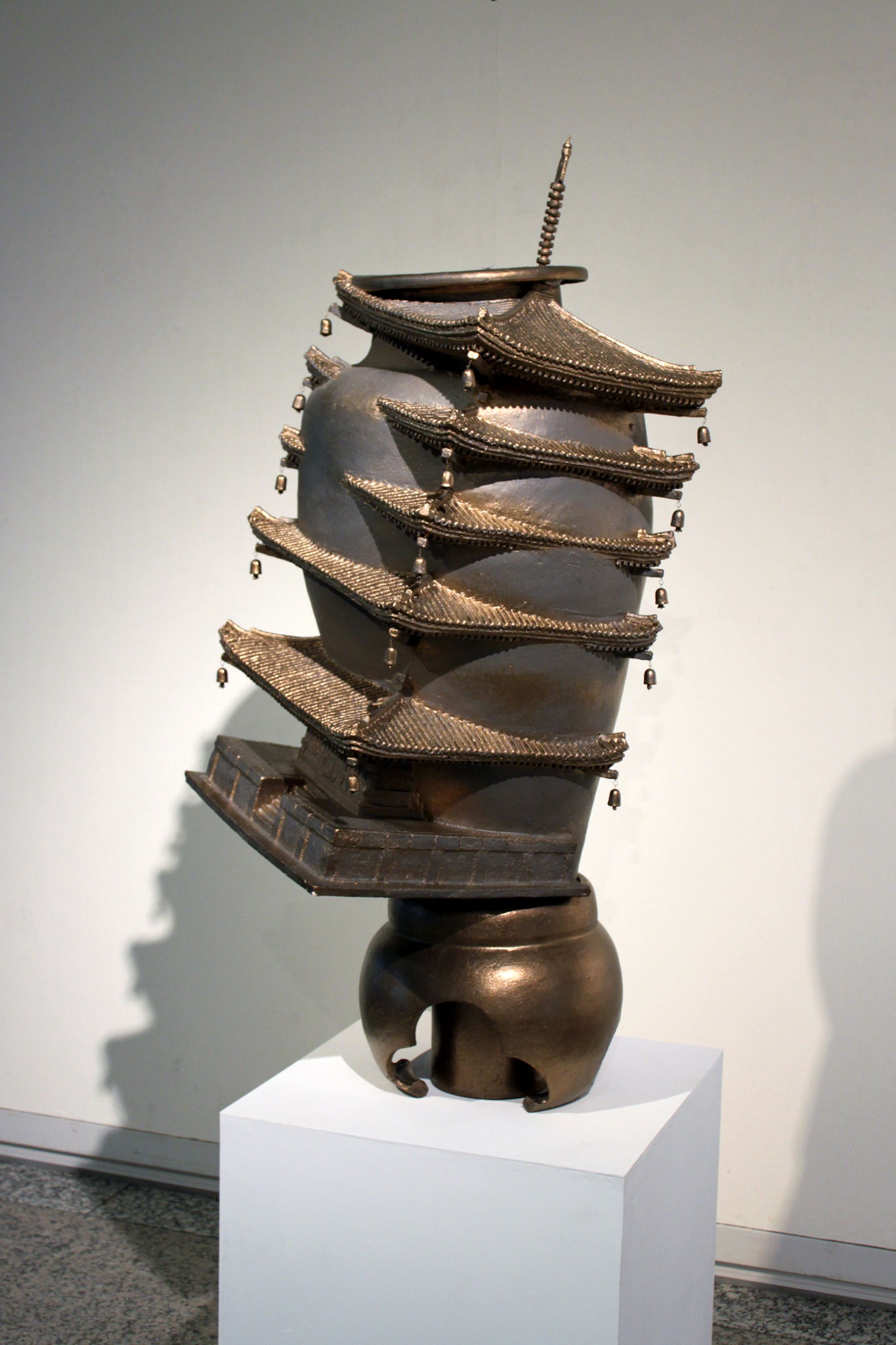 「器であって器でない」をテーマに陶作品を制作しています。この作品は2008年に制作しました。その頃より、現在まで一貫して続けているテーマです。装飾は、主となる器に添えられるものですが、装飾であるモチーフ(五重の塔)を、装飾の範疇を超えるようなスケールと構成で器(壷)に合体させる事で、器=主、装飾=従という関係を壊し、謎のものに仕立て上げる試みです。丸みのある壷のフォルムに唐突に突き刺さる直線的な五重の塔のラインがどこかおかしみを感じさせています。独自の技法ではなく、一般的伝統的な陶芸材料・技法を用いて制作しています。http://keikomasumoto.main.jp