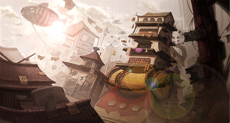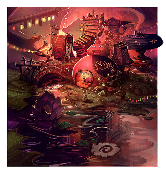 This is one of the environment designs that I've done for my collaboration project Bakuton. I enjoyed creating this piece because it was a new breakthrough for me as our project involved both Japan and Western art style. I was deeply inspired by one of my childhood movie called A Chinese Ghost Story: The Tsui Hark Animation and I wanted to create the environment similar to that. Therefore I used red lights as the main lighting source and put up some neon light to bring out the crowded, tipsy, flirtatious nightlife atmosphere. Without overtaking by the lighting, I enhanced the shape language and the silhouette of the village and I also make the proportion of the village slightly unlogical as I don't think human size of measurements are suitable for Youkai's village. To make the design more storytelling, I tried to put up some Youkai weird behaviour on it, such as making the river as a Ramen soup by adding some flower, leaf and naruto on the river, a Japanese bridge, a sashimi on a sushi shop and a wine house with a wine shape.