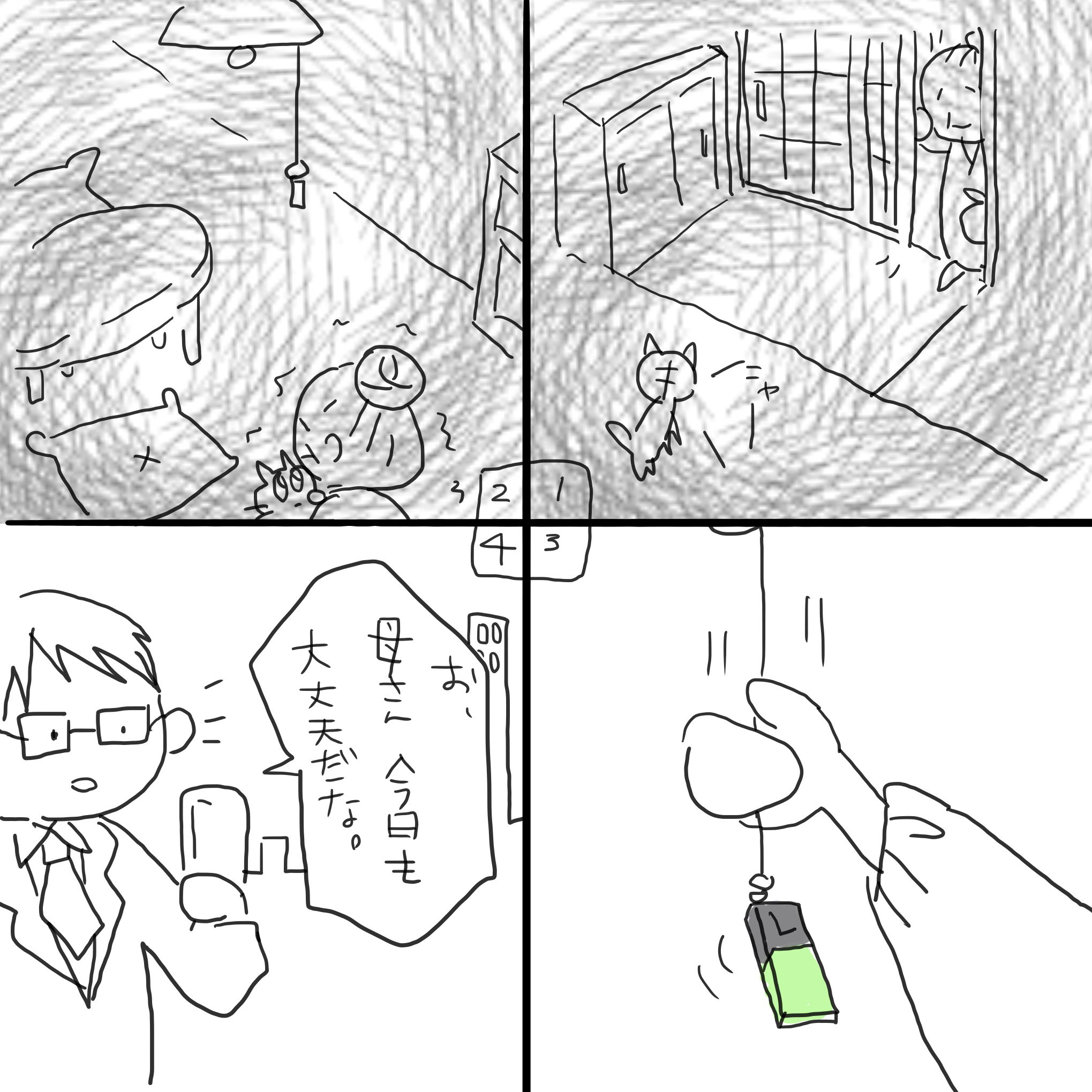 電気の紐につけておき、ひっぱると家族に連絡が入るシステムです。