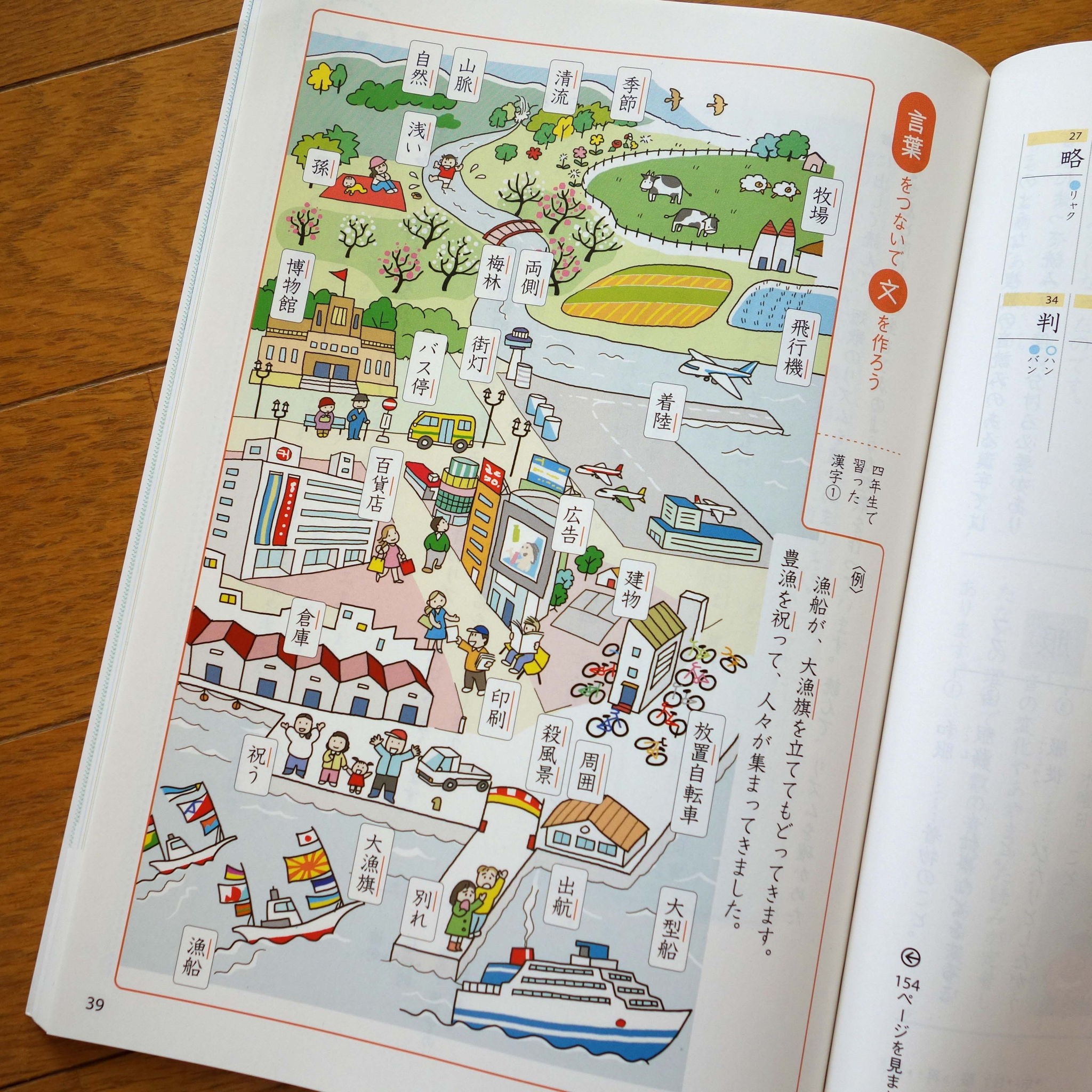 学校図書の教科書「小学校国語五年(平成27年度)」で、漢字の学習ページのイラスト挿絵を描きました。