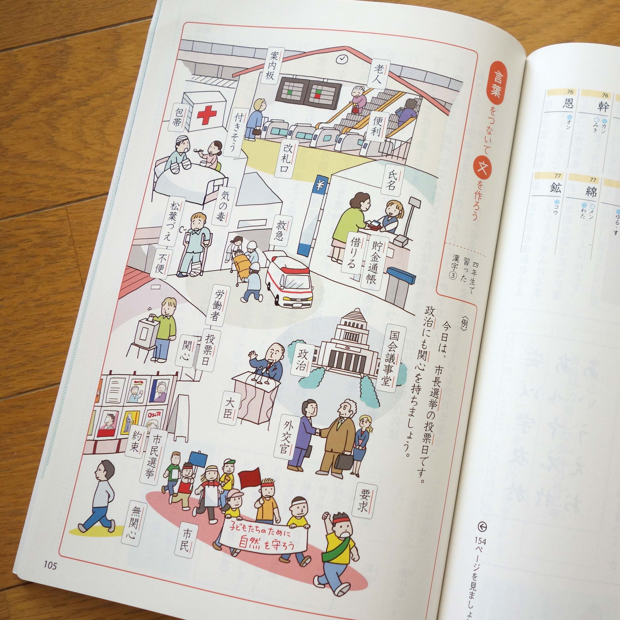 学校図書の教科書「小学校国語五年(平成27年度)」で、漢字の学習ページのイラスト挿絵を描きました。