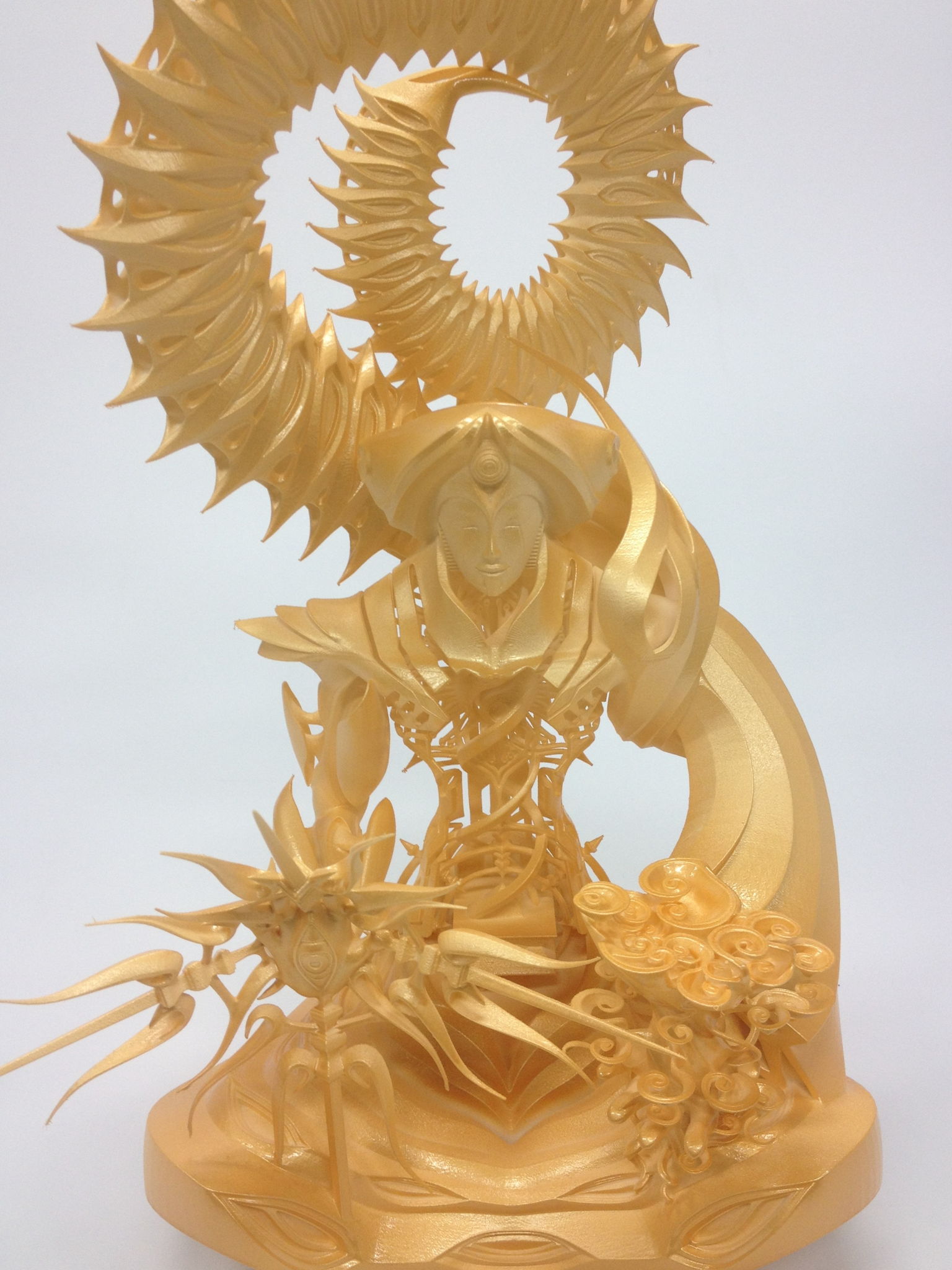 この「薬師如来像」は『YAOYOROZ』プロジェクトの第一作として製作されたものである。この像のシェイプには私に影響を与えてきた日本の文化「縄文」、「仏教」そして「サブカルチャ」が全て含まれている。数多くの文化的影響は、私というフィルターを通り、凝縮され、ひとつの像の上で曼荼羅的に展開される。仏像はどの時代においても、その時代最高のテクノロジーとデザインを使用して製作されてきた。我々の時代のおいても“現代”を象徴する仏像が必要なのである。デザイン上重要なファクター、日本の「サブカルチャ」は単なるオタク文化ではない。日本のサブカルチャの精神/デザインは、遥か縄文に連なるアニミズムの直系なのである。現代の日本人としてのアイデンティティを太古「縄文」に求め、それと現代とを繋ぐことによって、ひとつの大きな円環を完成。その円環をもって未来へのアイデンティティとするのである。「現代」と「太古」の融合、「伝統」と「技術」の融合」。思想・コンセプトをシェイプに落とし込み、サブカルチャ的な「カッコヨサ」で見せることがこの像の目的である。3DPの出現により、私は自分の頭の中に生成されたシェイプをよりダイレクトなカタチでこのセカイに結びつけることができる。3DPはプロダクトの制作に使われることが多いが、もっと純粋なアートとしての可能性を持っている。この像は、コンテンポラリなジャパンの「サブカルチャ」「アート」「技術」を融合させた一つのマイルストーンである。