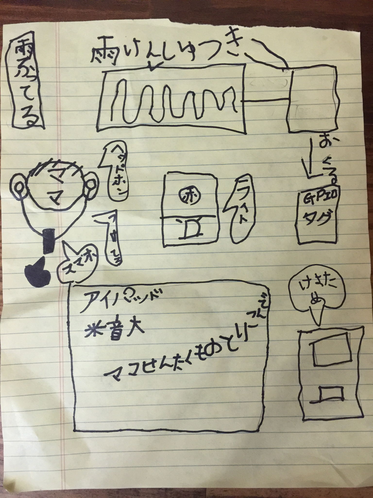 まず、雨がふってくると、雨けんしゅつきからGPIOタグにおくってiPadにつたえます。そうすると、「ママせんたくものとりこんで〜」といい、スイッチで音を止めることができます。ママがヘッドホンをしてるときのために、ライトを赤くひからせてしらせます。