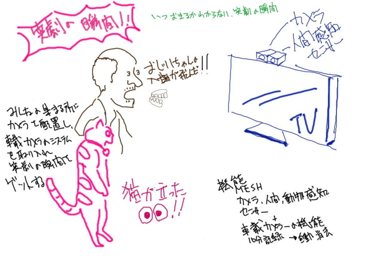 カメラ,人感センサー(提案MESH)を家でみんなが集まる所に配置ます。動きを感知し笑劇の瞬間を撮らえます。