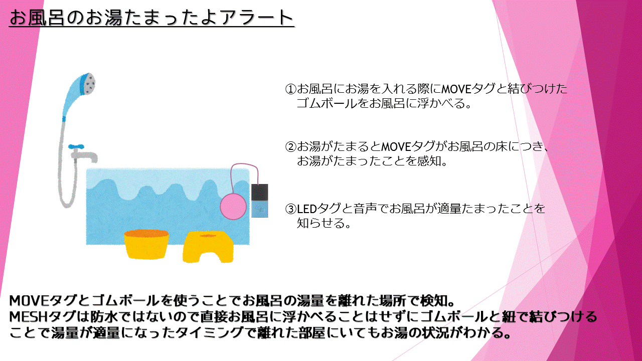MOVEタグとゴムボールを使うことでお風呂の湯量を離れた場所で検知。