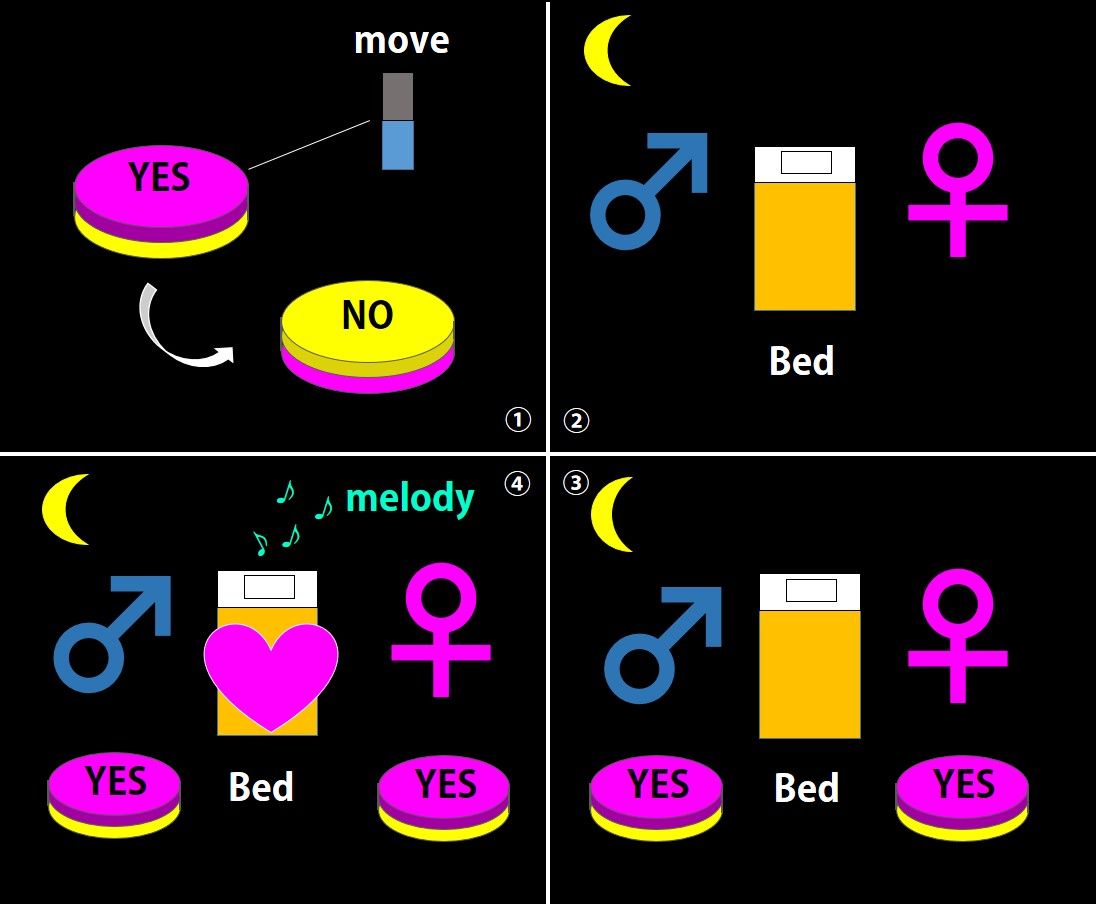 どちらか片方がNOだと何もおきないが、二人ともYESの場合ロマンティックなmelodyが流れ自然に夜の営みに入ることができる。