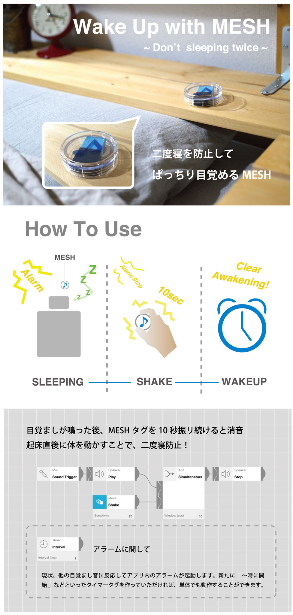 解説:朝起きることが辛い人のための、Meshを使った目覚ましです。アラームが鳴った後、MESHを10秒間振り続けることで、アラームを停止させます。目覚め時に体を動かすことでぱっちりと目を覚まし、二度寝を防止します。起きてMESHを振るというアクションに対し、アラームを止めることに加えて電球の点灯やラジオ起動など様々なフィードバックへと発展の可能性を秘めている提案となっています。