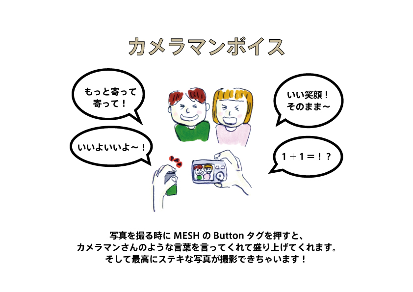 写真を撮る時にButtonタグを押すと、カメラマンさんのような言葉を言ってくれて盛り上げてくれます。