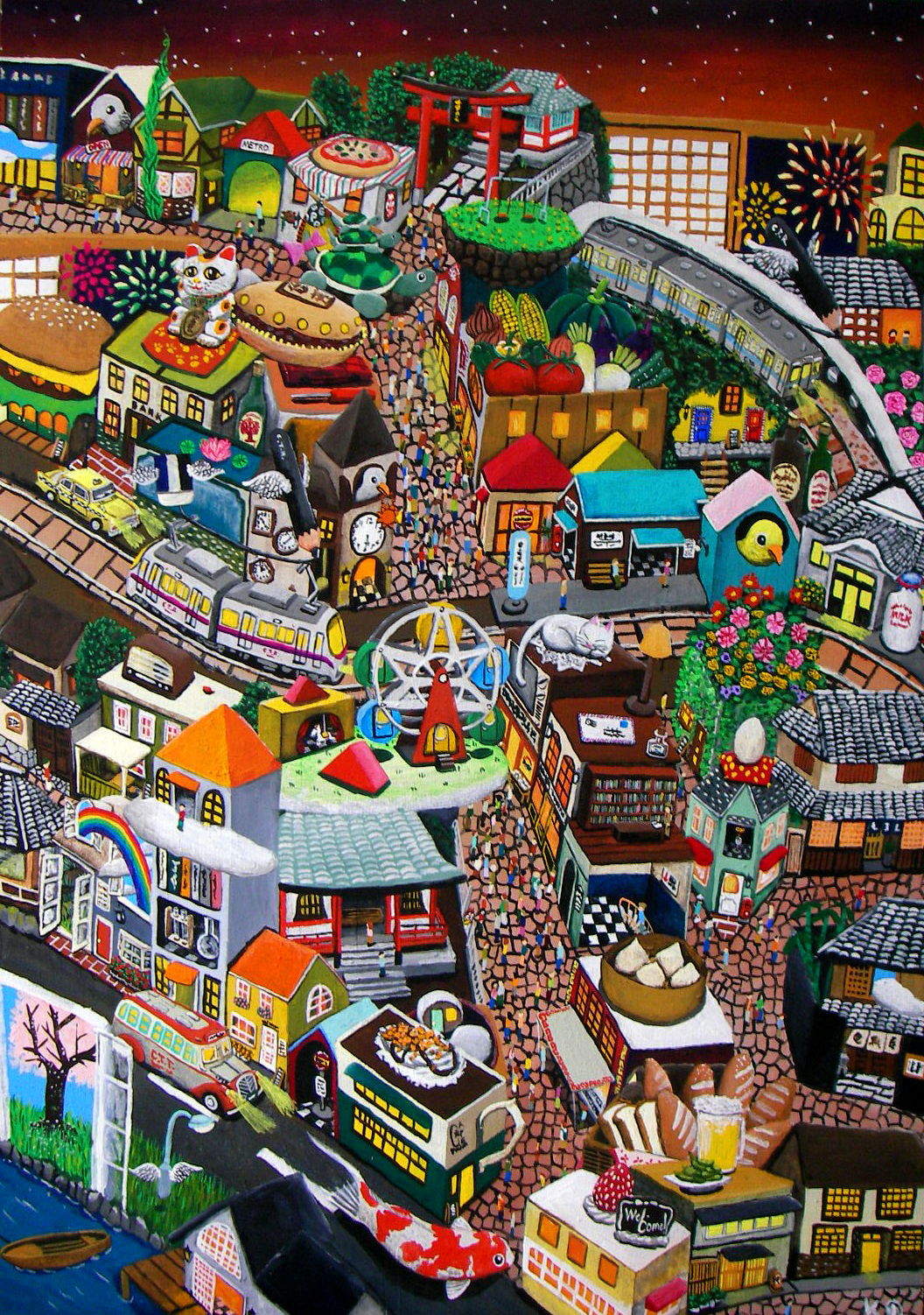 描くに当たっては(「神楽坂アートスクエア」に出ると言う事で)「神楽坂をベースにはしているが、何処か違う街並み」を描きたかった...と言うのがありました-夢を見ている時によくあるような「(自分のよく知っている)その場所には有り得ないものが目の前にあるのに違和感を感じていない」と言う様な感覚とでも言いますか。