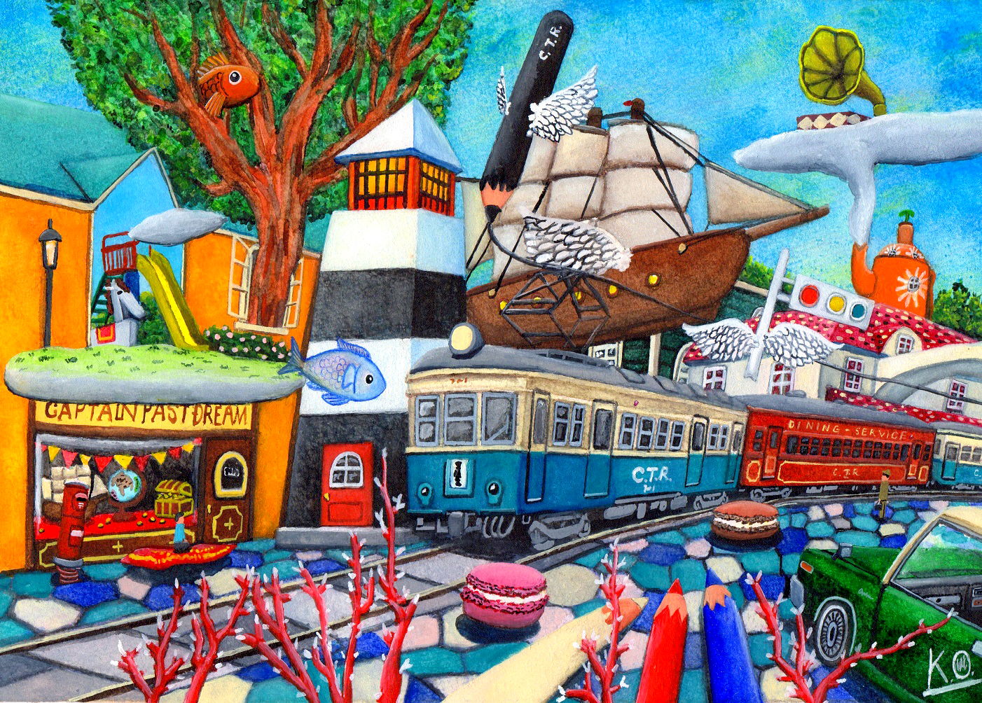 水 彩紙に水彩絵の具・水彩色鉛筆で描いた後にA4サイズ(297×210)よりやや大き目のサイズに切り取ったもので、メキシコにプエルト・バジャルタ(Puerto Vallarta)と言う街の写真を眺めていた時に、街中に「灯台」がある写真を見て「街中にも灯台が存在してもいいんだな」とふと思ったのがきっかけで 描いたもの。
