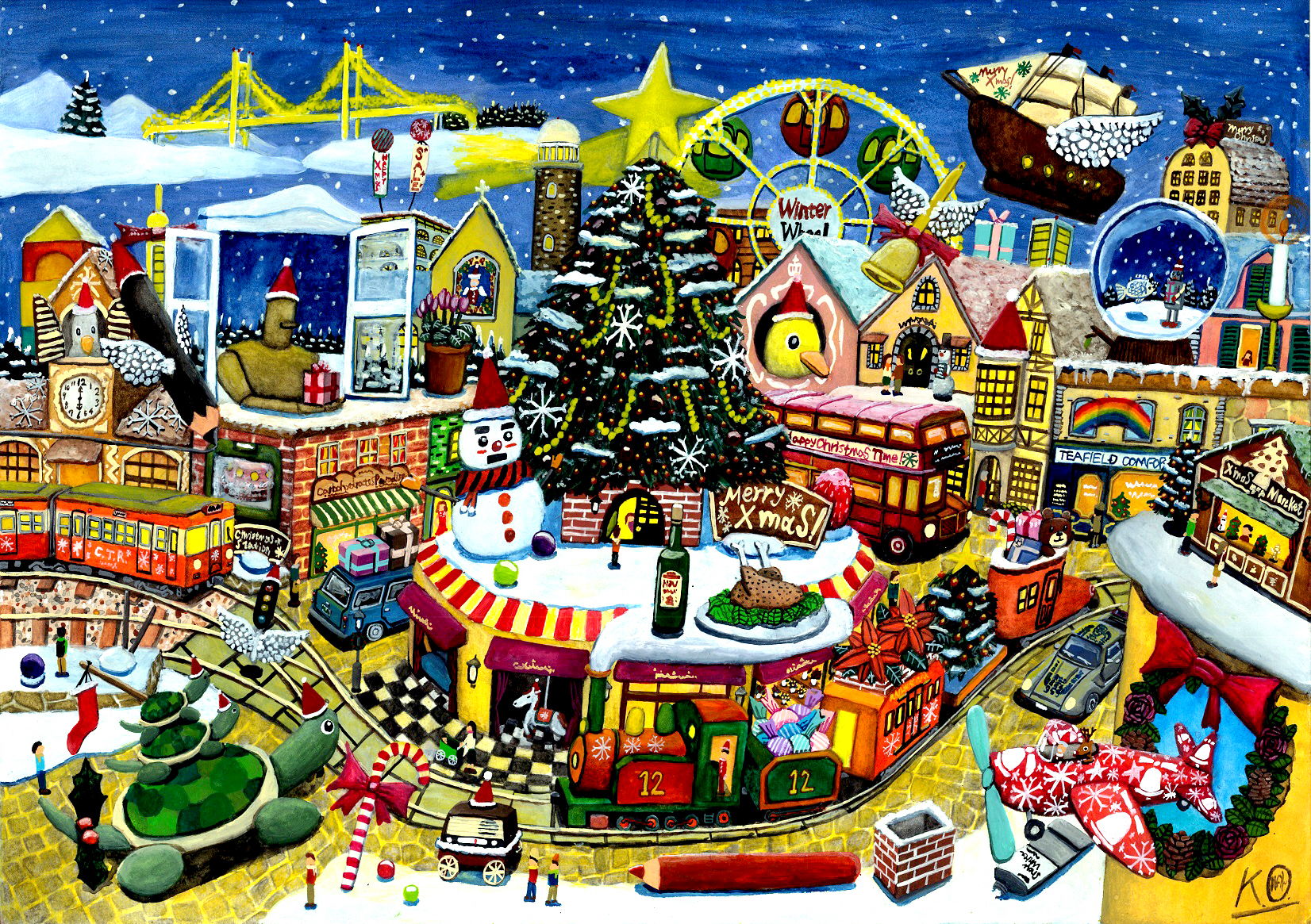 ただ、5年前に描いた一連の「それぞれの駅のクリスマス」は同じA4サイズである事から3枚併せて線路が繋がっているように見えるように描きましたが、今回 の「それぞれの駅のクリスマス(5年後の駅)」はA3サイズで線路が繋がっているように描くのは難しかった(※どうしても下部に描きたいモチーフがあった と言うのもある)事から、(5年前の描いた「それぞれの駅の~」とは)違う位置に線路を描いております。