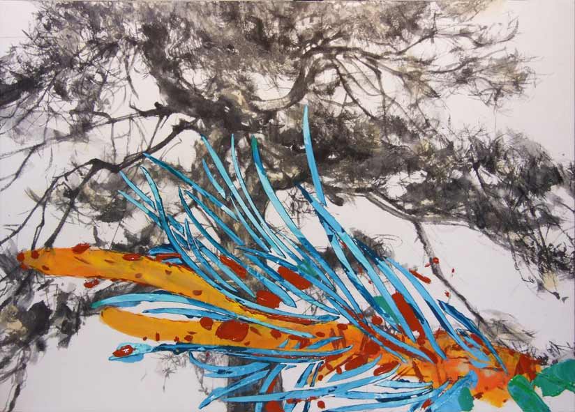 極めてベタなアクリルを緻密に描き進んだ墨絵の上にのっけた。