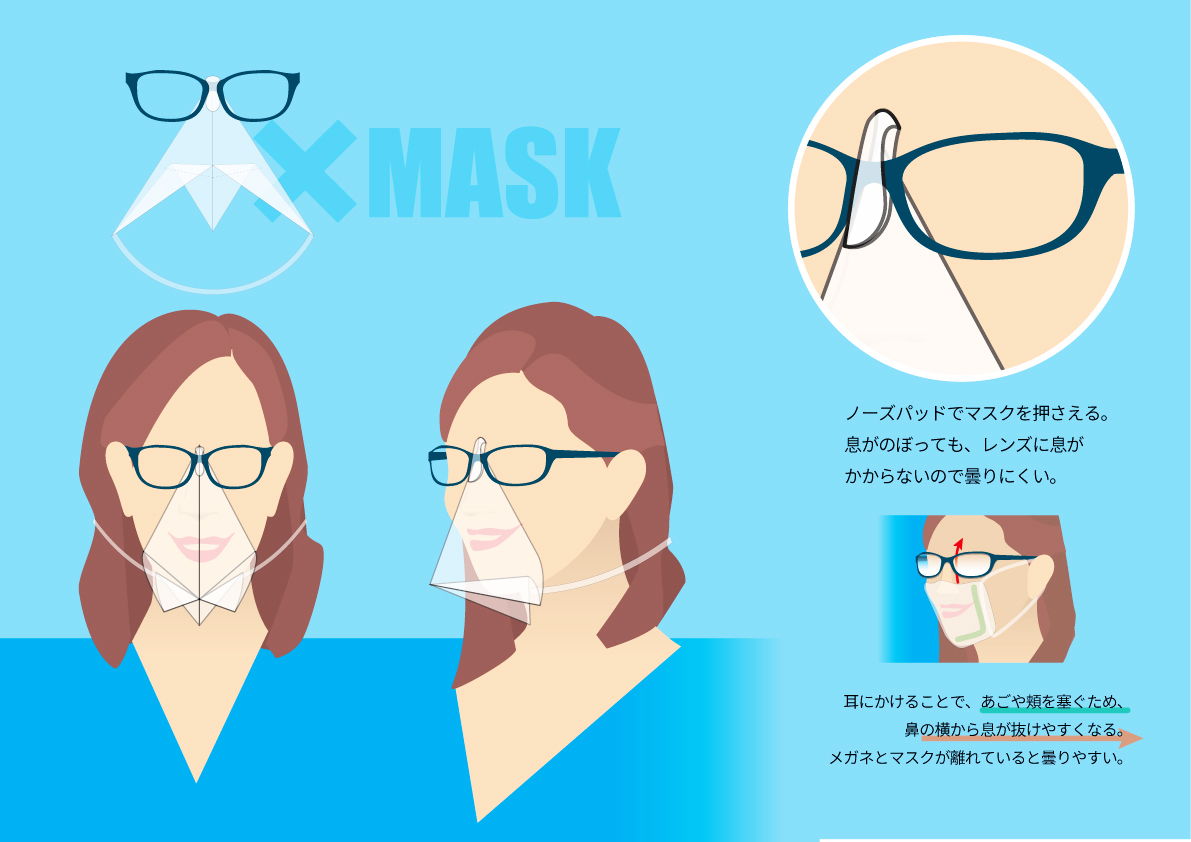 マスクをノーズパッドで押さえ、ヒモ(ゴム等)でマスクの両端を引き固定します。