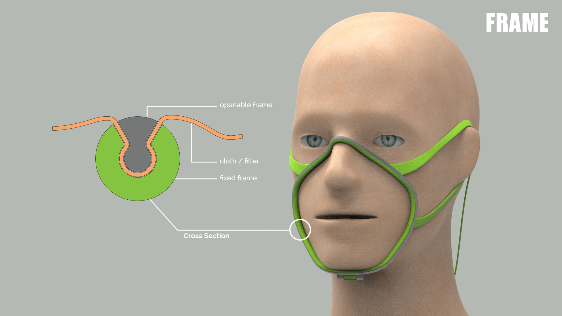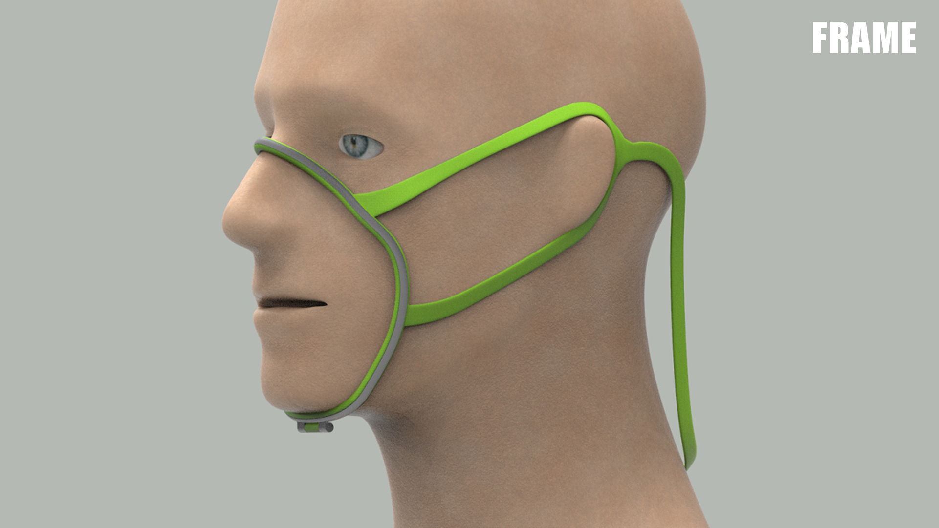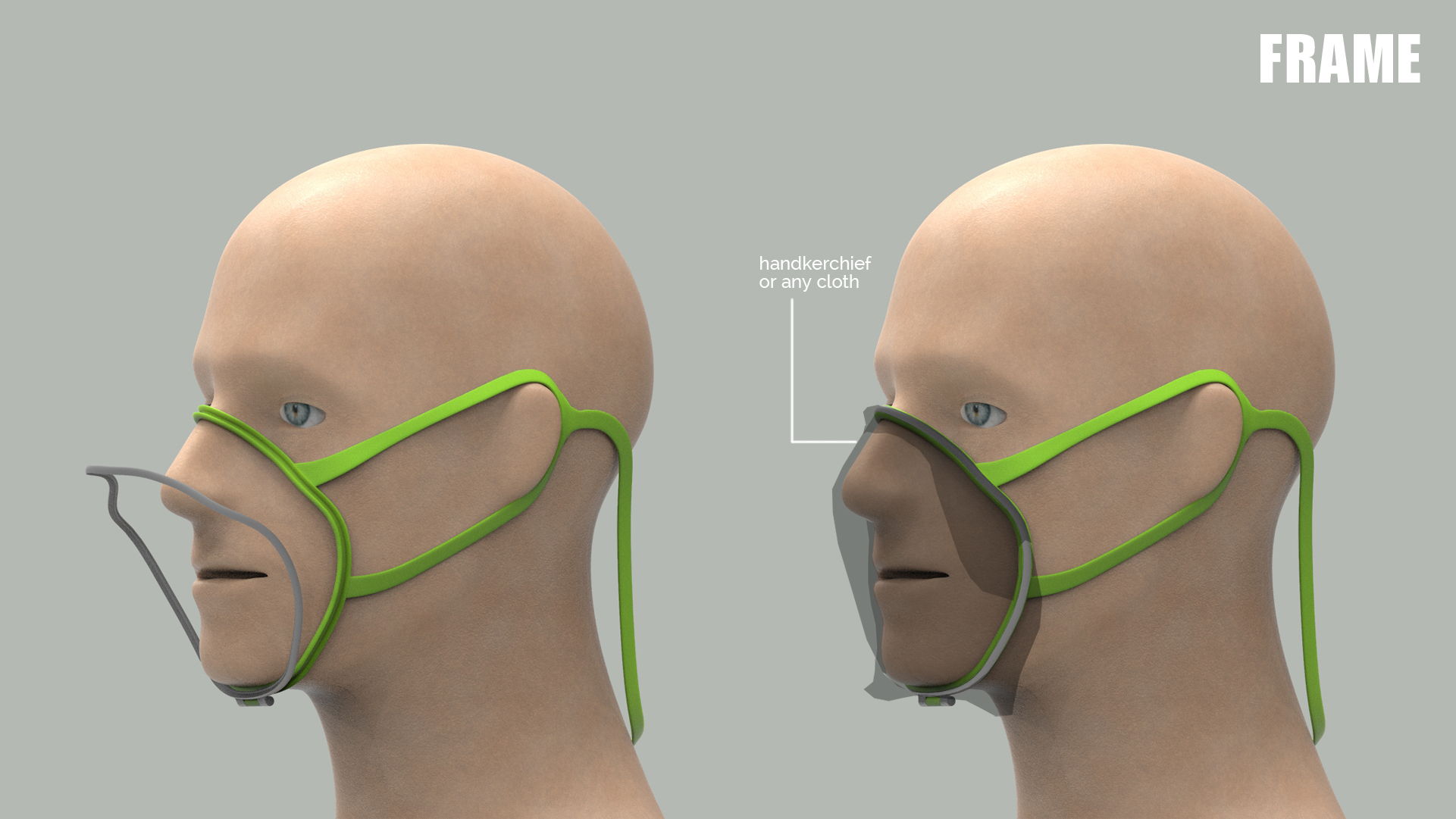FRAME is the most minimal respiratory mask ever. As the name suggests, it is just a molded frame consisting of two parts hinged together; a male and a female. The frame has a silicon band connected to it. The male part opens up allowing the user to lock a handkerchief or any simple cloth in the frame and use it as a mask.