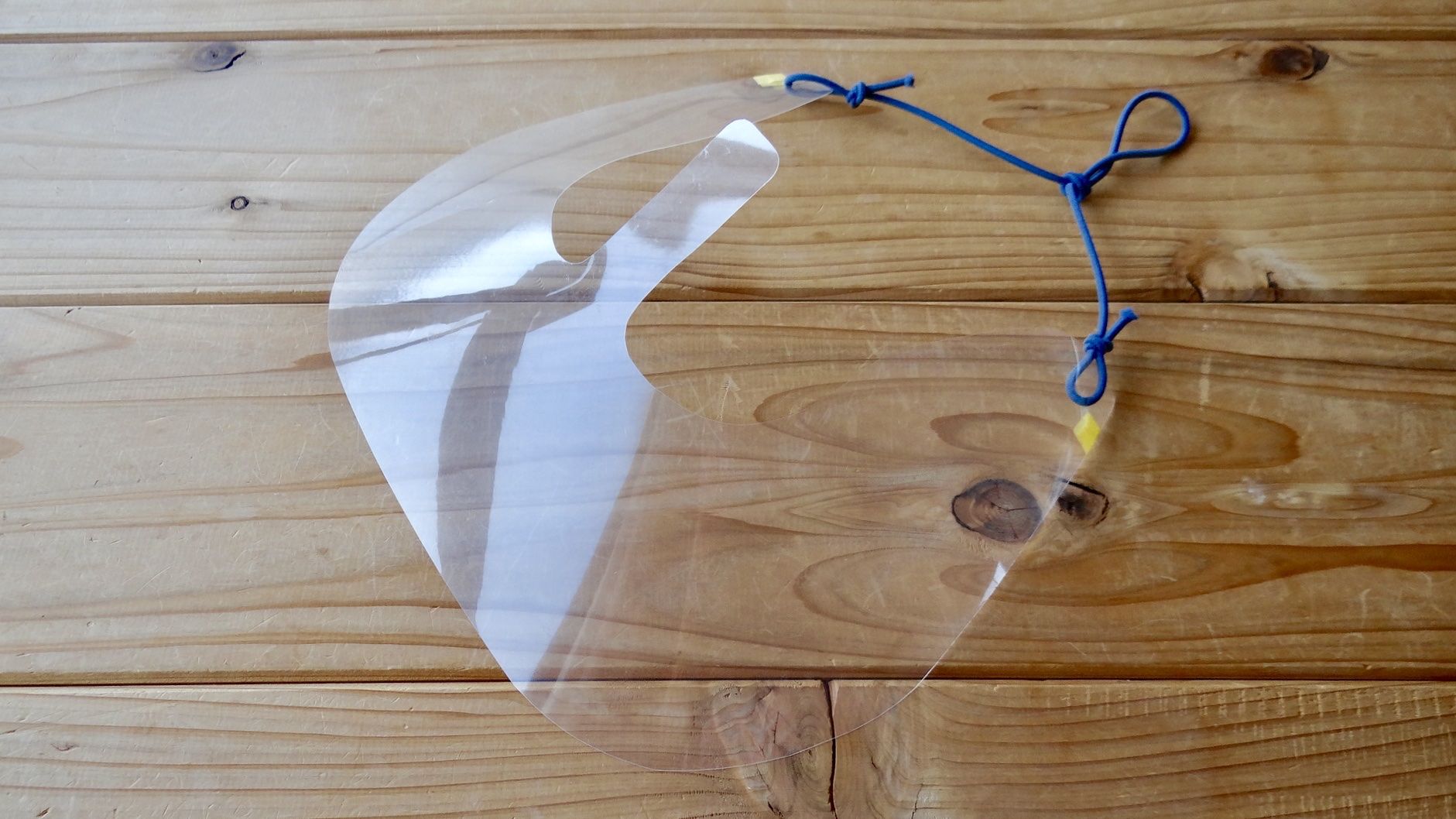 医療従事者の方々が着用するフェイスシールドを参考に、これを目元から下だけにしたようなものがよいと考えました。口元が大きく開いていますし、樹脂製であるため、上記の要求を満たすことができます。