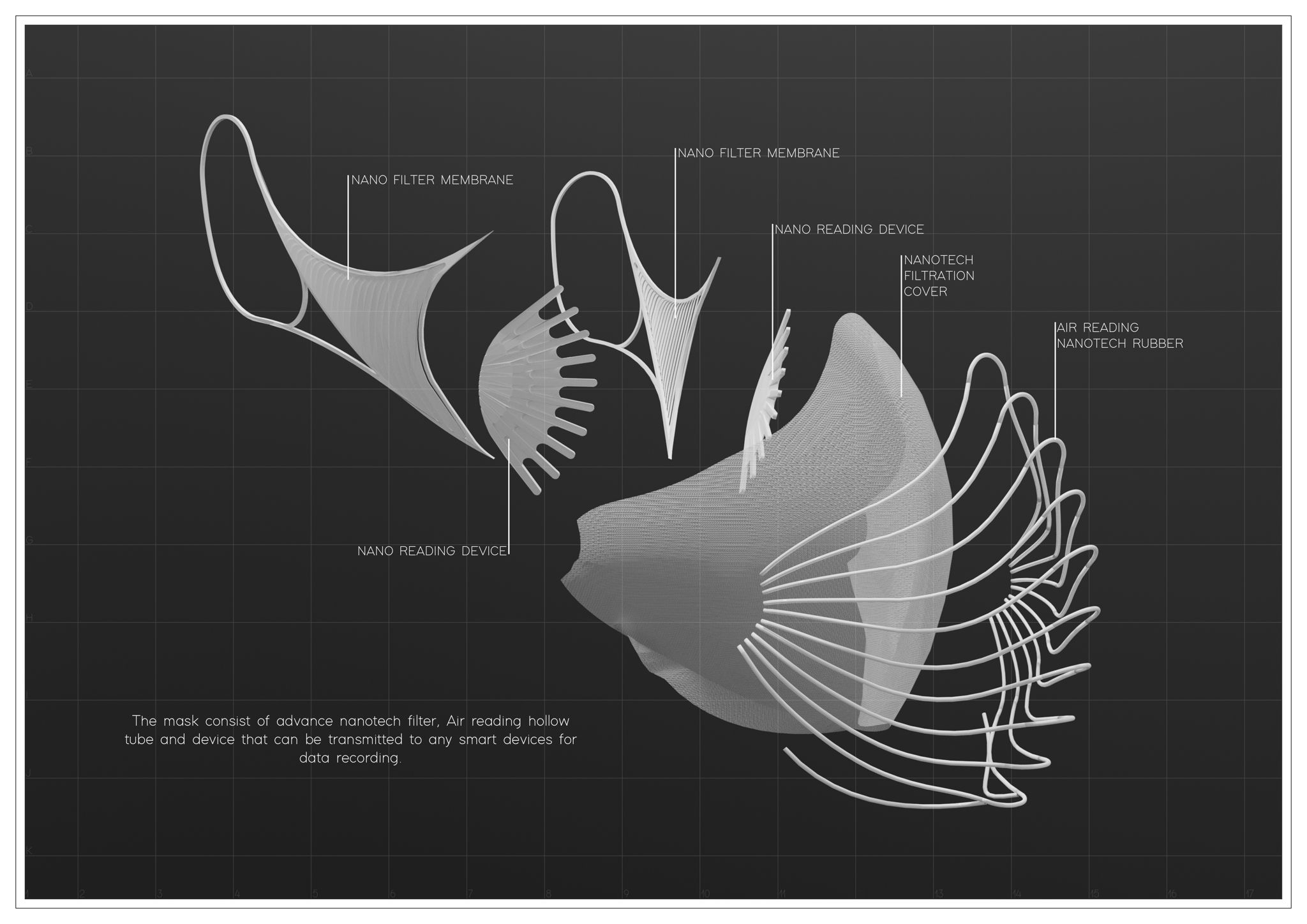 Branchial Mask is an anatomical mask that conforms to the anatomy of face. Drawing elements of fish gill system, biomimicry and nanotech, the mask acts like a lightweight, flexible membrane that functions to filter out virus and harmful particles at the same time allowing easy access flow of oxygen into the respiratory system.