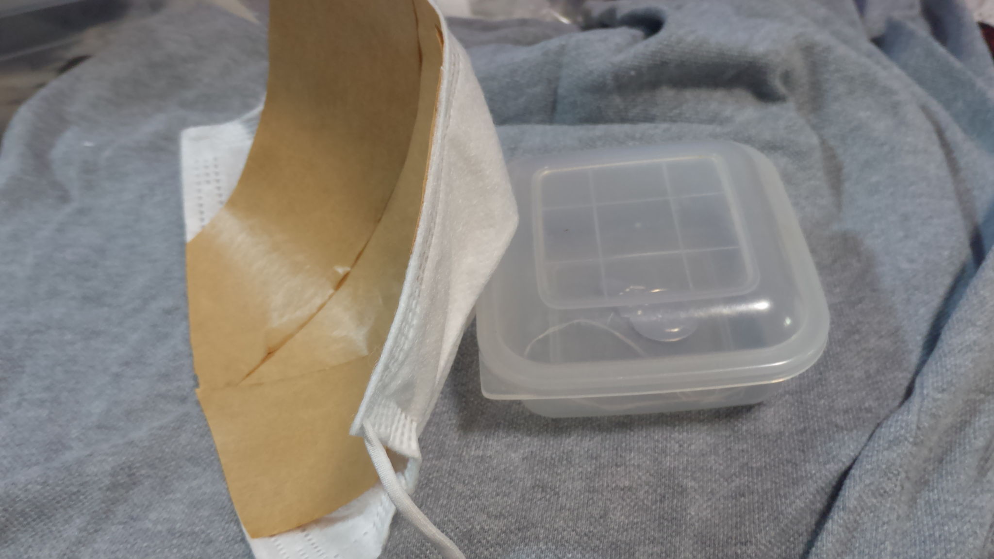 鼻毛をダイソーの雑巾のパイルで再現し、通常のサージカルマスクの裏にガムテープを張り空気を遮断して、パイル地にかぶせる事でパイル地とサージカルマスクの間に隙間が出来、サージカルマスクの隅から口、鼻の間を空気が攪乱されながら進む事になり、鼻腔を表現した。