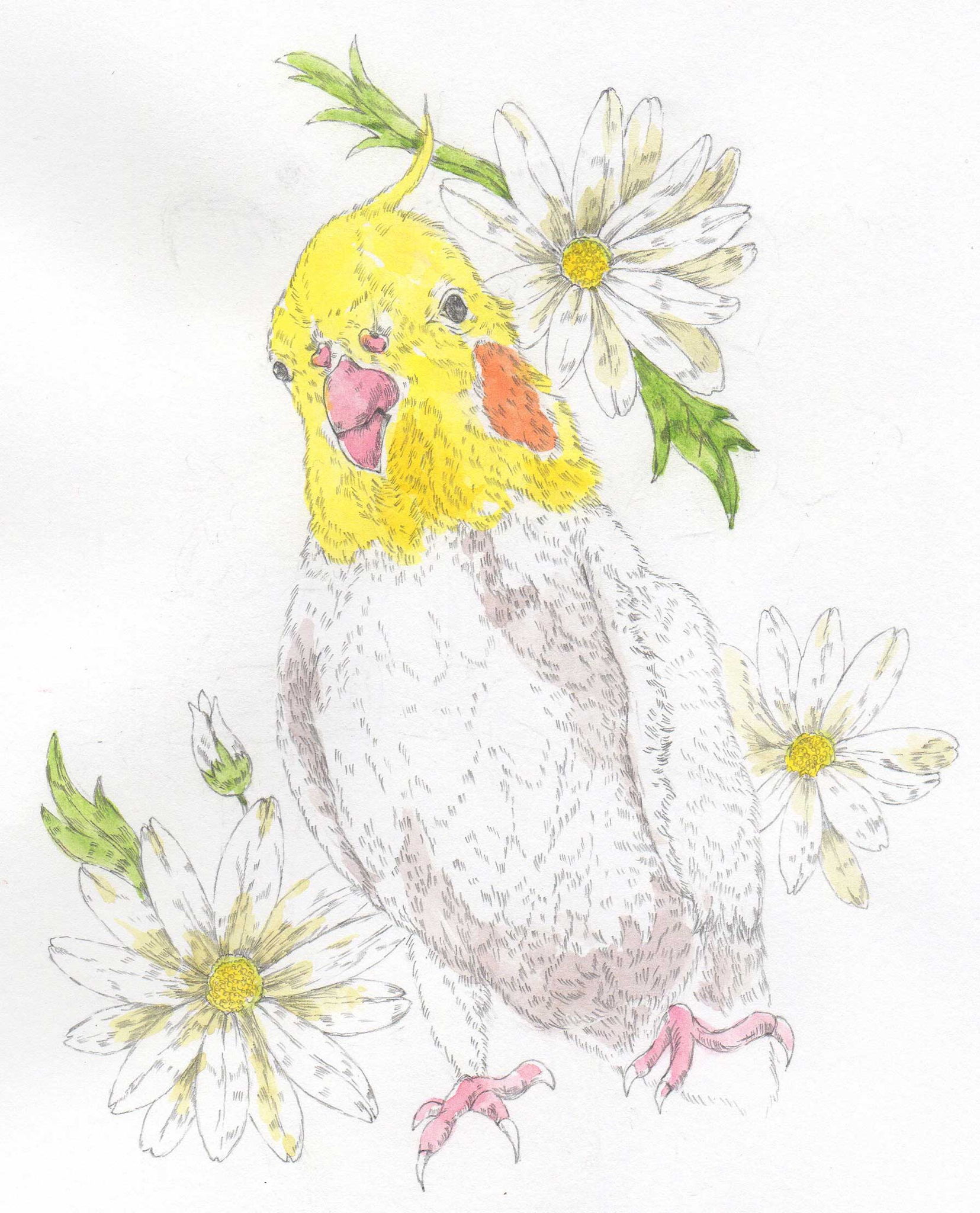 女性向けの年賀状として鳥と花をモチーフに描きました。