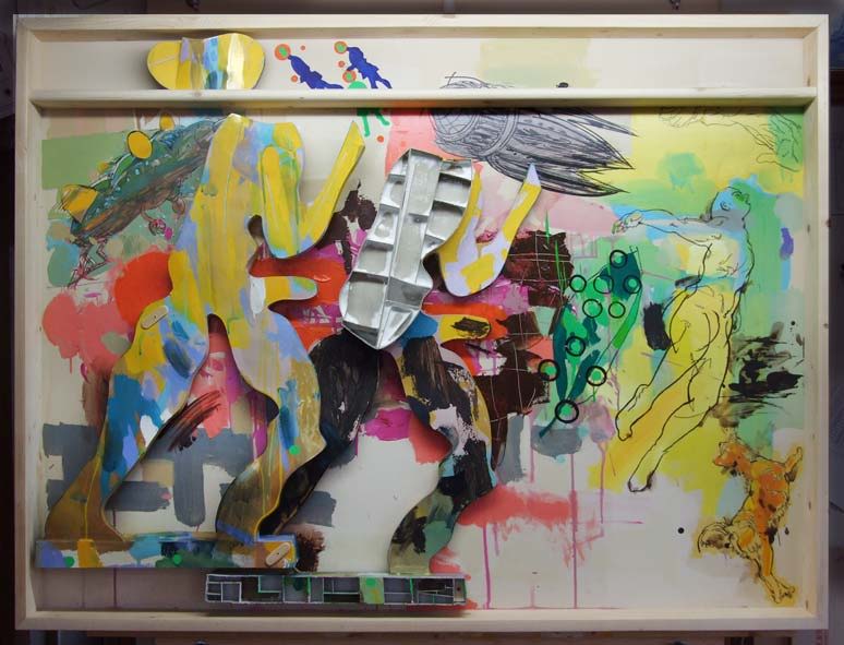 *123.5x92.8cm ボール紙による半立体、アクリル描画、木材での箱形。