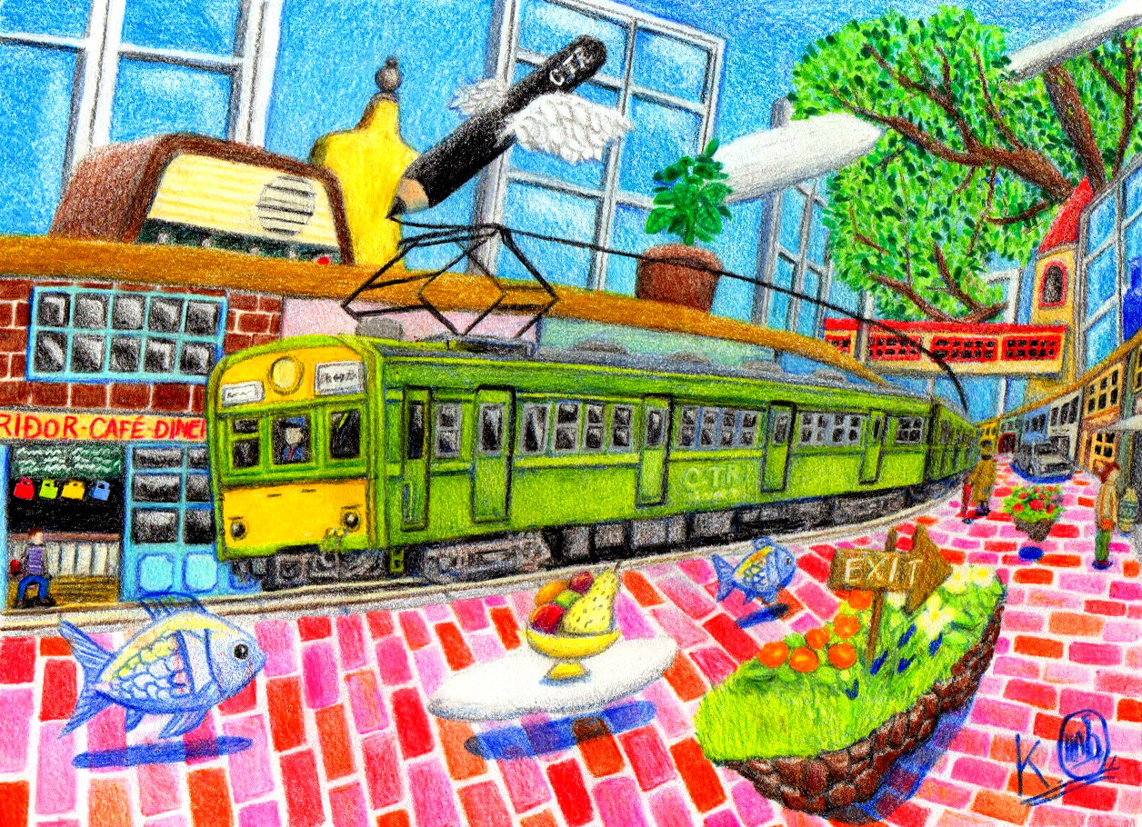 何となく「併用軌道上を20mクラスの旧型国電の車両が轟音を立てて走ってきたらどうだろう」などとふと思い立った...と言う本当に軽いきっかけで描いたのですけど、やはり絵の具との描き方(と言うよりは塗り方)の「勝手」の違いは感じました。