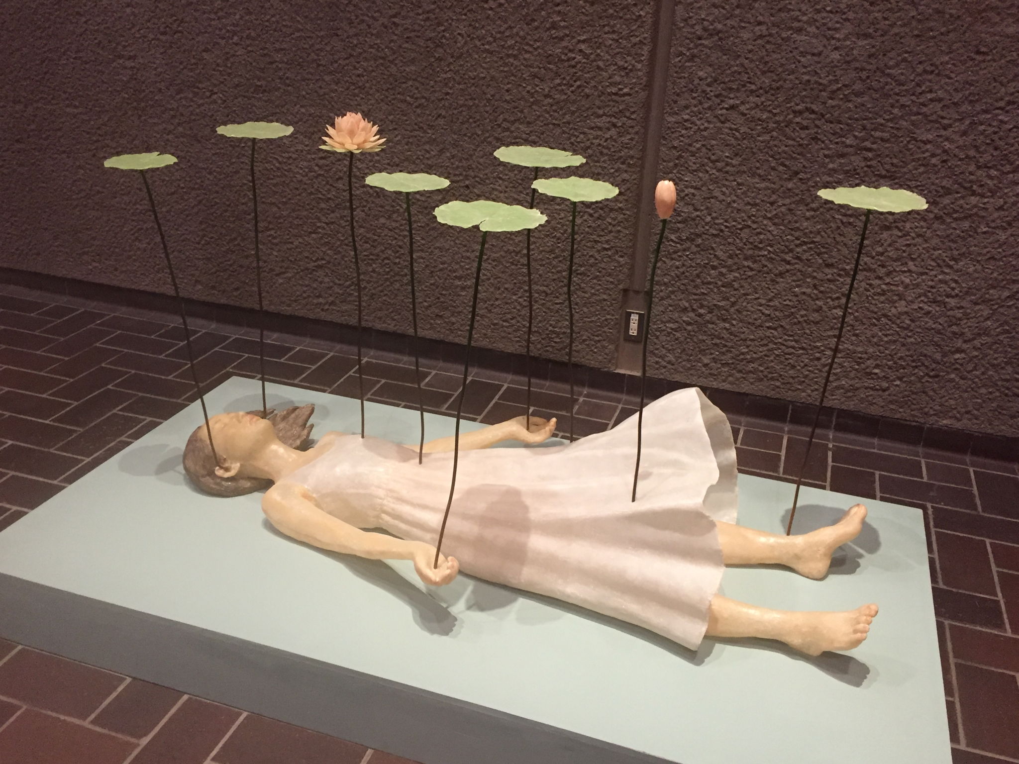女性もきっと生まれ変わるだろうという希望を込めて、水底に沈んだ女性が蓮に生まれ変わり花を咲かせる姿を表現した。