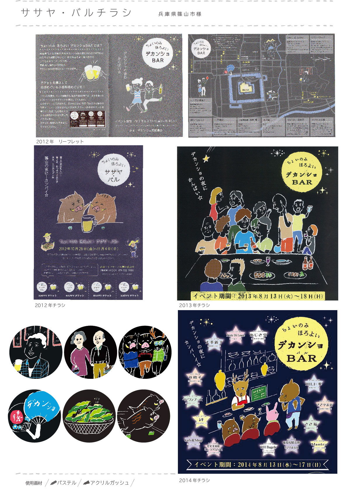 毎年篠山で行われるササヤバルのチラシです。いつもとは違い、紺の紙に夜っぽく描きました。