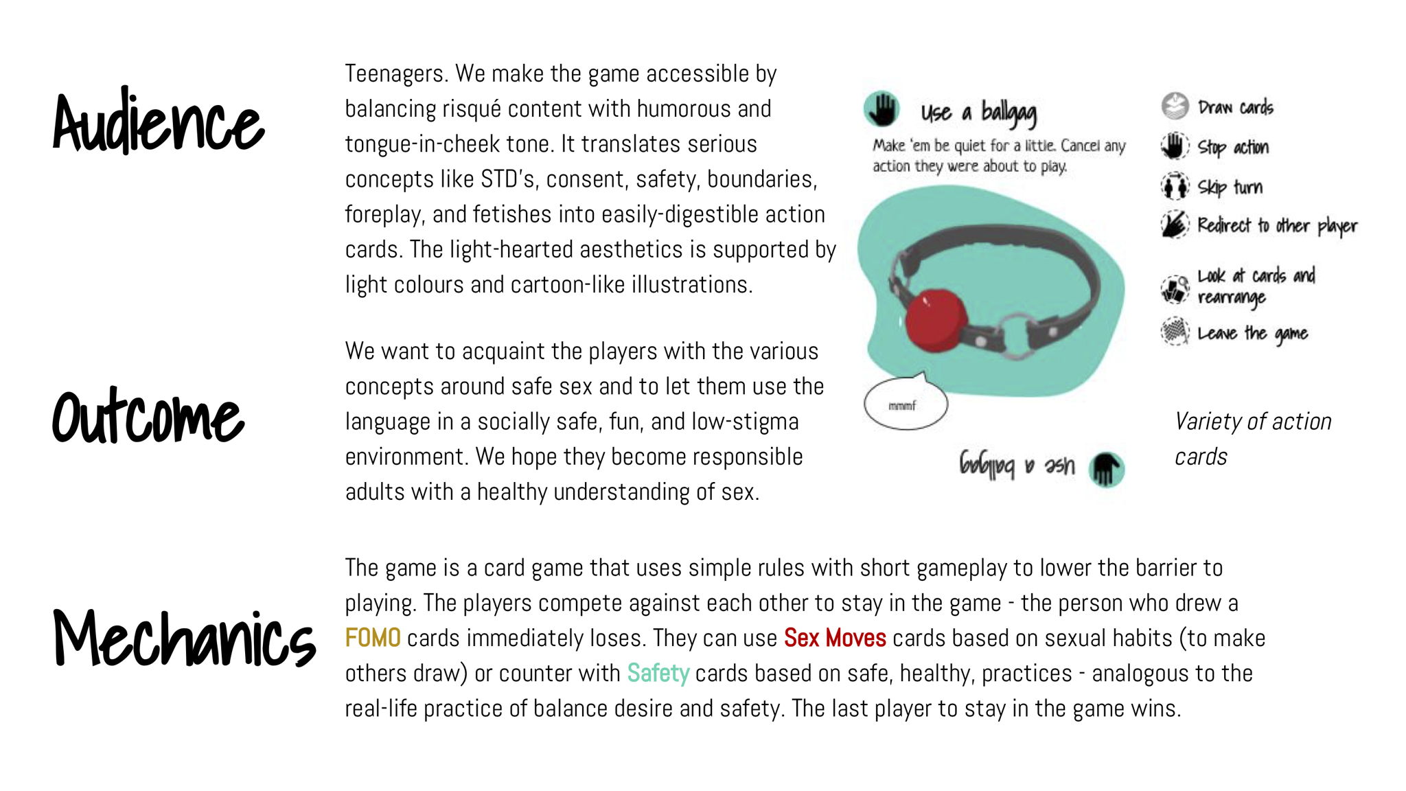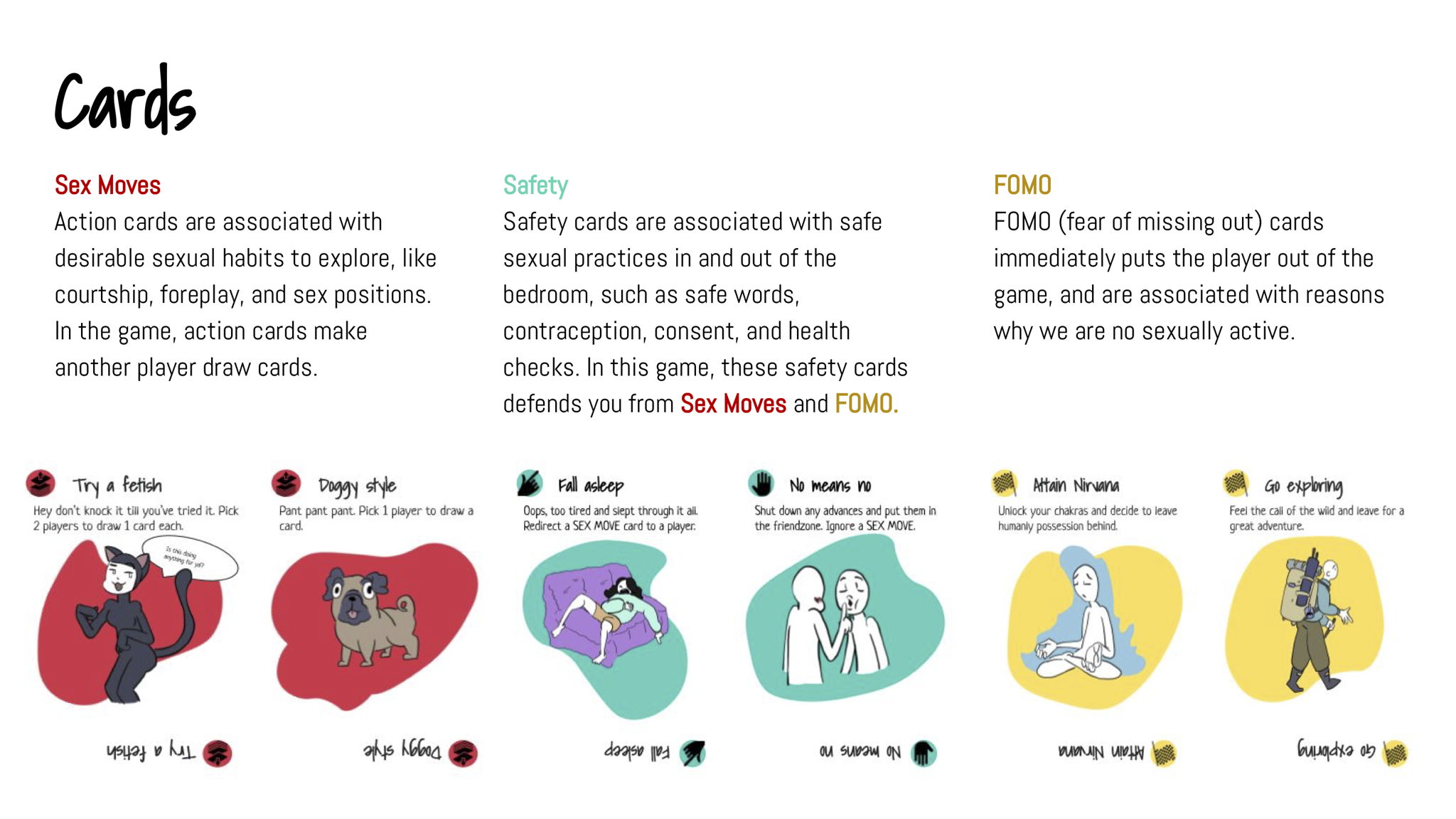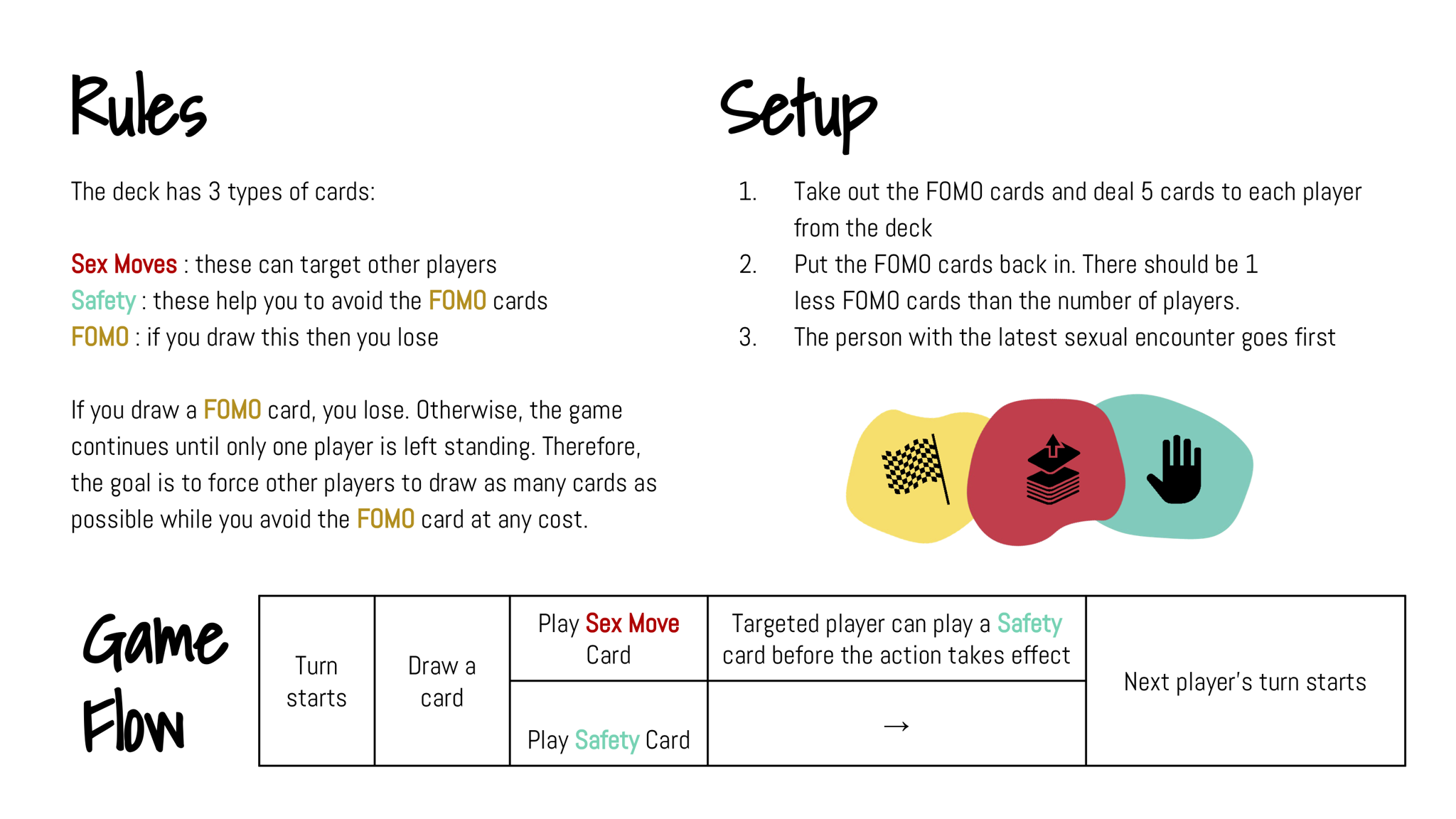 “Bang it out” is a card game with one simple rule: to win the game, a player must avoid drawing the “lose” card. The deck contains three types of cards. “Action” cards portray fun, desirable sexual habits, which forces others to draw “FOMO” cards, or Fear of Missing Out. “FOMO” cards portray possible reasons why one will no longer be having sex, which immediately puts the player out of the game. Unless they can counter it with “Safety” card which reflects safe, healthy, sex practices.