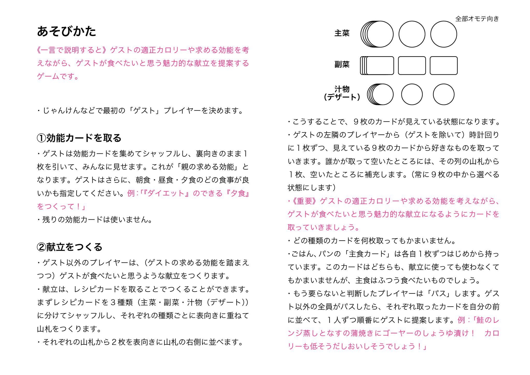 衣食住は生活を密接に関わりながらもなかなか学習が難しい分野ではないでしょうか?特に食については毎日食べるものでありながら、学ぶ機会は実際に自炊を始めるまでありません。そんな食をいち早く学び、献立作成を軸にして、相手に喜んで貰えるレシピを提供しつつ、それが栄養バランス的にどうなっているのかを学ぶことが出来るゲームです。