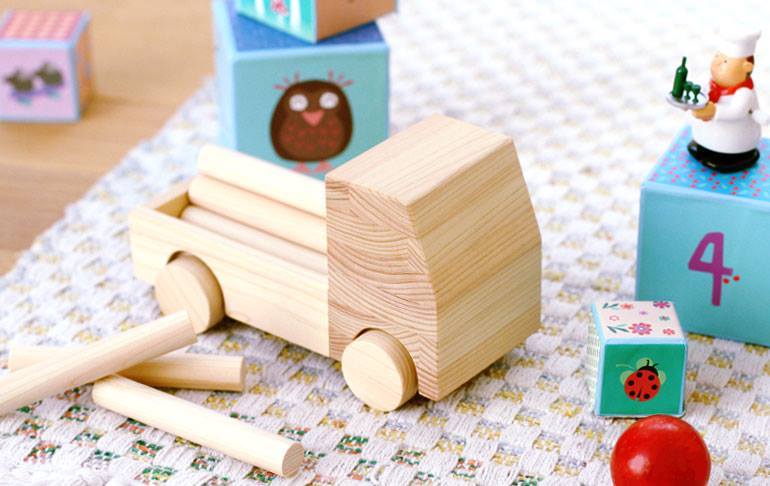 あまり木でできた材木運搬トラックのおもちゃです。トラックの荷台に材木に似せた円柱を積み木のように重ねて落とさないように走らせて遊びます。丸太を並べて数を数える練習もできます。