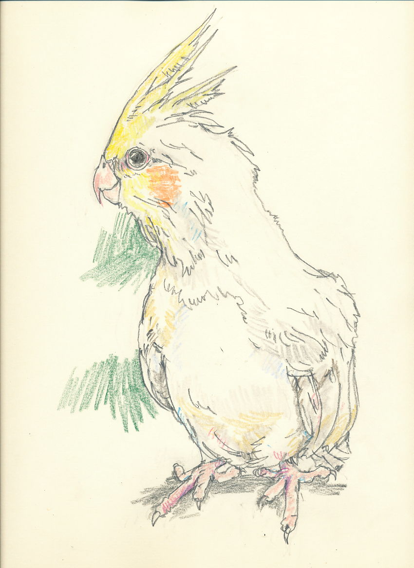 似顔絵タッチに描いた色鉛筆と鉛筆のラフなオカメインコ