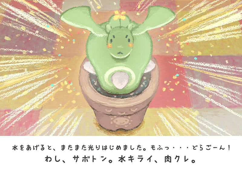 「サボトンの実」は植木鉢と水で育つ、へんてこ宇宙せいぶつサボトンと女の子めぐのお話。