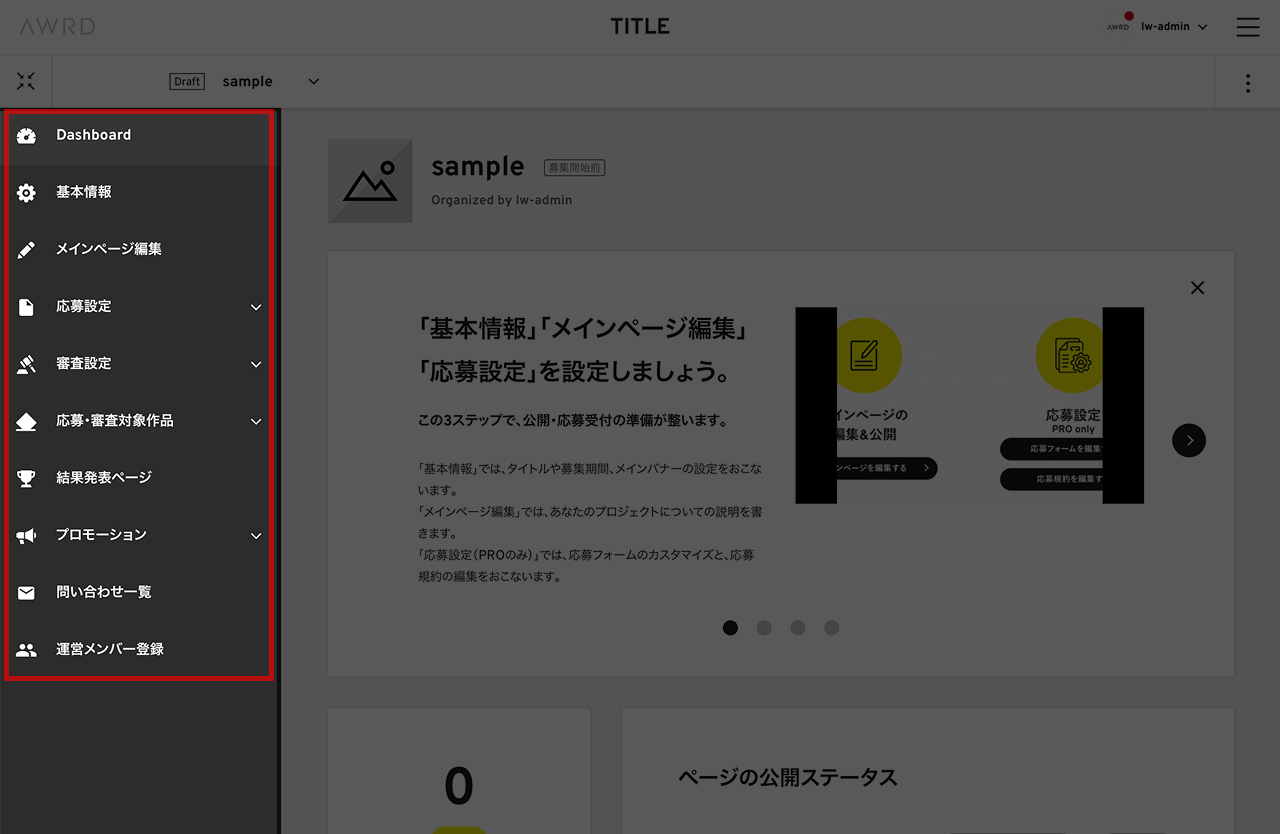 AWRDに登録後、メインページの作成、応募作品の管理・審査、結果発表までスムーズに行うことができます。